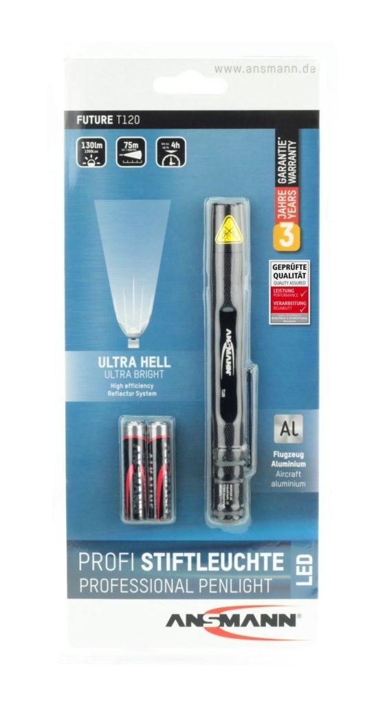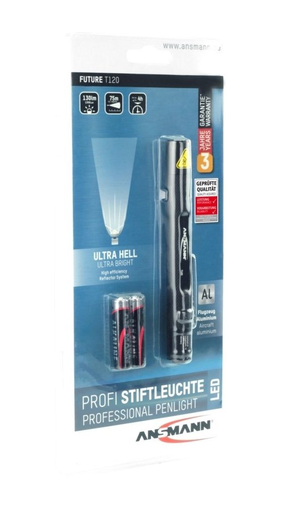 Die professionelle Stiftleuchte FUTURE T120 von ANSMANN besticht durch ihre optimalen Gehäuseproportionen und griffige Oberfläche aus hochwertigem Aluminium. Durch die Verwendung eines großen Ein- und Aus-Schalters in der Endkappe ist die Lampe ideal für den Einhandbetrieb geeignet, auch mit Handschuhen.
