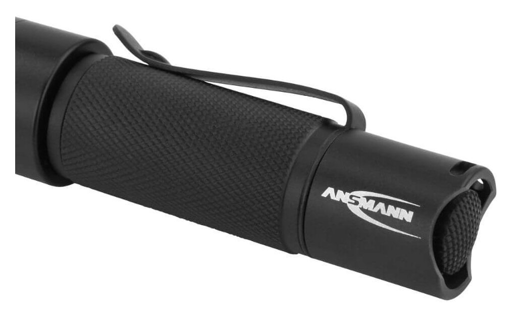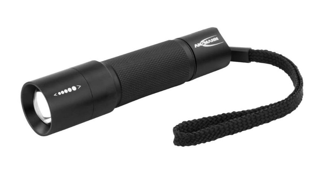 Taktische Taschenlampe mit stufenloser Fokussierung, inkl. 1x ANSMANN Alkaline Mignon AA Batterien, abnehmbarem Halteclip und Handschlaufe