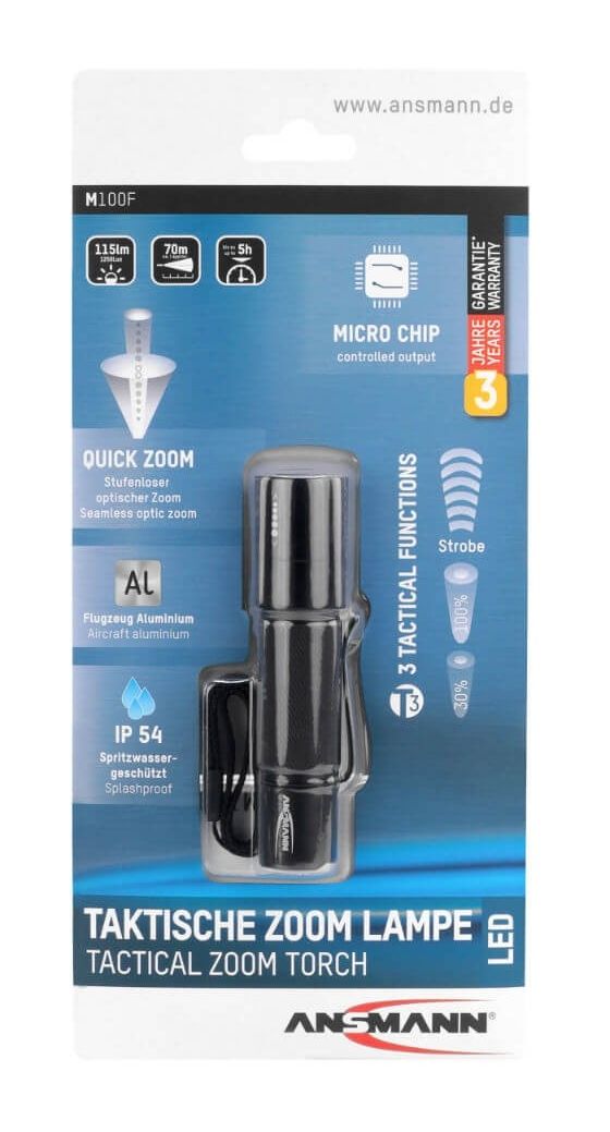 Die professionelle Taschenlampe M100F von ANSMANN besticht durch ihre optimalen Gehäuseproportionen und griffige Oberfläche. In Verbindung mit dem mikrokontrollergesteuerten Endkappenschalter ist die M100F für taktische Einsatzgebiete geeignet und erlaubt das lautlose Schalten der drei Leuchtfunktionen 100% Leuchtkraft, 30% Leuchtkraft, Stroboskoplicht durch leichtes Antippen des Schaltknopfes. Durch die robuste und sehr griffige Gehäuseoberfläche ist die Taschenlampe M100F ideal für den rauen Einsatz, auch im Einhandbetrieb oder mit Handschuhen.