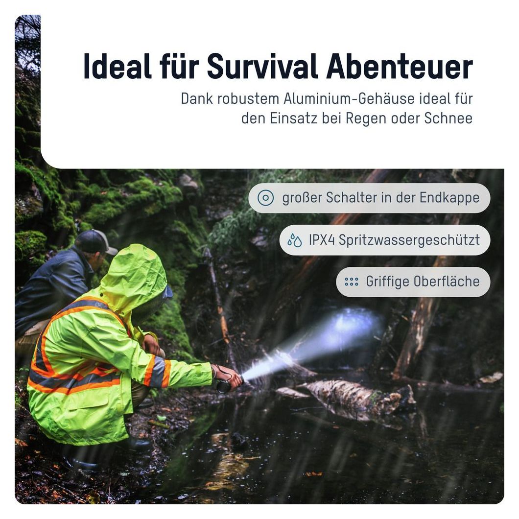 Die hochwertige Survival-Taschenlampe von ANSMANN überzeugt durch ihr durchdachtes Design und ihre verschiedenen Funktionen. Das robuste Aluminium-Gehäuse (IK07) mit griffiger Struktur bietet einen sicheren Halt in der Hand unter allen Bedingungen. Der taktische Endkappenschalter sorgt für zuverlässige Einhandbedienung – selbst bei Kälte, Nässe oder mit Handschuhen. Dank IPX4-Schutz ist die Lampe zudem aus allen Richtungen spritzwassergeschützt – ideal für den Einsatz bei Regen, Schnee oder in feuchter Umgebung.