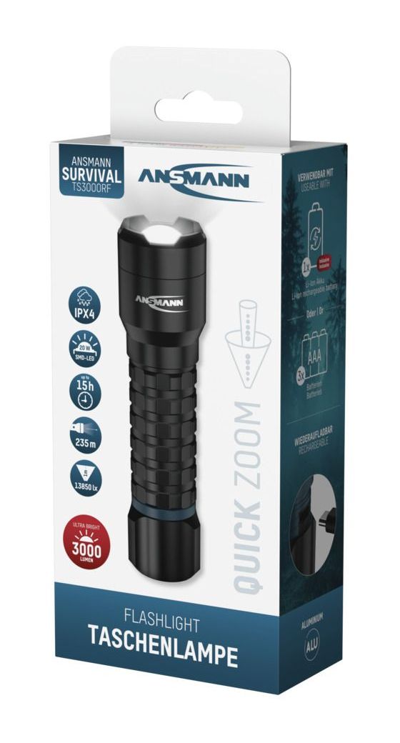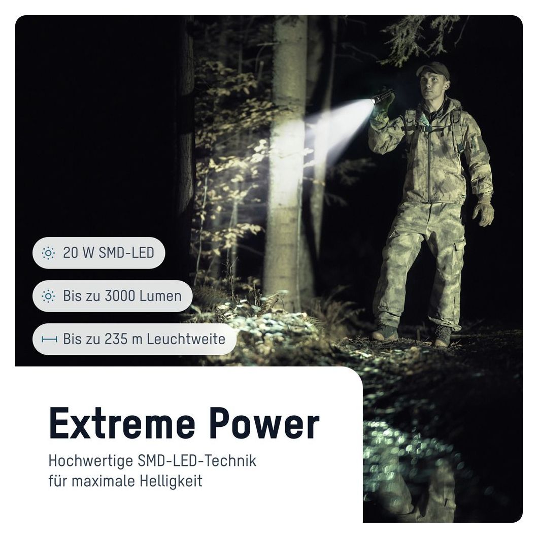 Ausgestattet mit seiner hochwertigen 20 W SMD-LED liefert die TS3000RF eine beeindruckende Helligkeit von bis zu 3000 Lumen und erreicht dabei eine Lichtstärke von 13.850 Lux. Die starke Lichtleistung sorgt für exzellente Ausleuchtung auf einer Distanz bis zu 235 Meter. Mit ihren vier wählbaren Leuchtmodi - High, Middle, Low, Boost - und der stufenlosen Fokussierung passt sich die Taschenlampe jeder Anforderung an: von maximaler Helligkeit bis energiesparendes Dauerlicht im Nah- und Fernbereich.