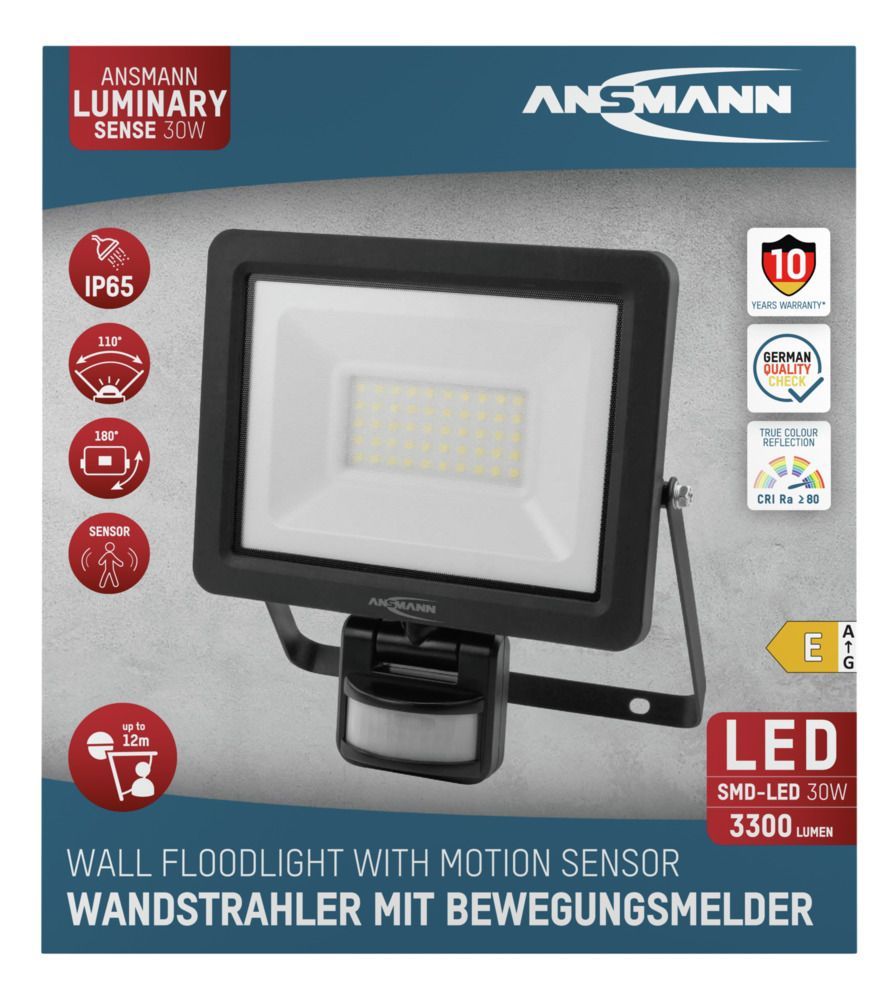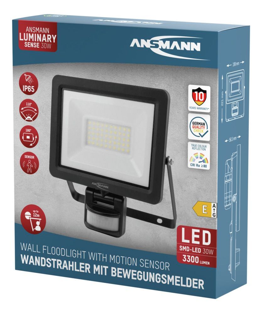 Robuster und kompakter 30 W ANSMANN Luminary LED-Wandstrahler mit PIR Bewegungsmelder, bis zu 3.300 Lumen
