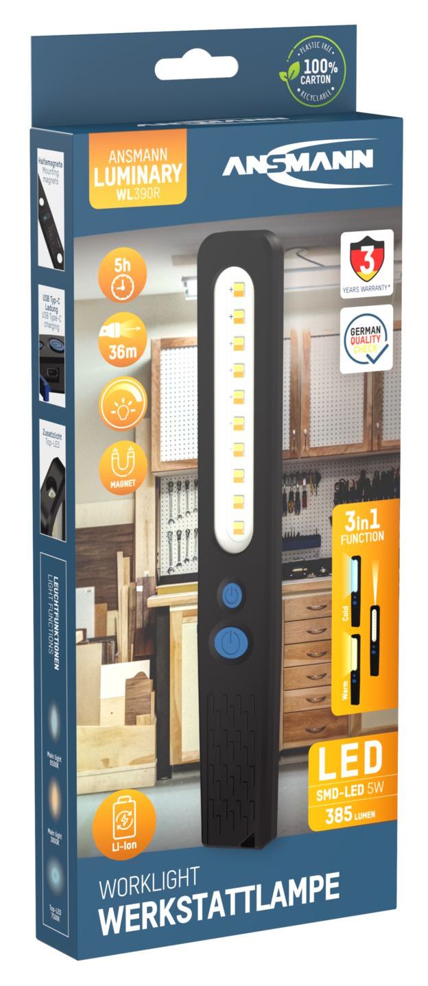 Ansmann WL390R. Lampentechnologie: LED, Lichtfarbe: Kaltweiße, Warmweiß, Lichtleistung: 385 lm. Produktfarbe: Schwarz, Gehäusematerial: Kunststoff, Internationale Schutzart (IP-Code): IP20. Energiequelle: Akku, Akku-/Batterietechnologie: Lithium Polymer (LiPo), Akku-/Batteriekapazität: 1200 mAh. Breite: 37 mm, Tiefe: 16 mm, Höhe: 240 mm. Anzahl Produkte pro Versandkarton: 33 Stück(e), Länge des Versandkartons: 390 mm, Breite des Versandkartons: 282 mm