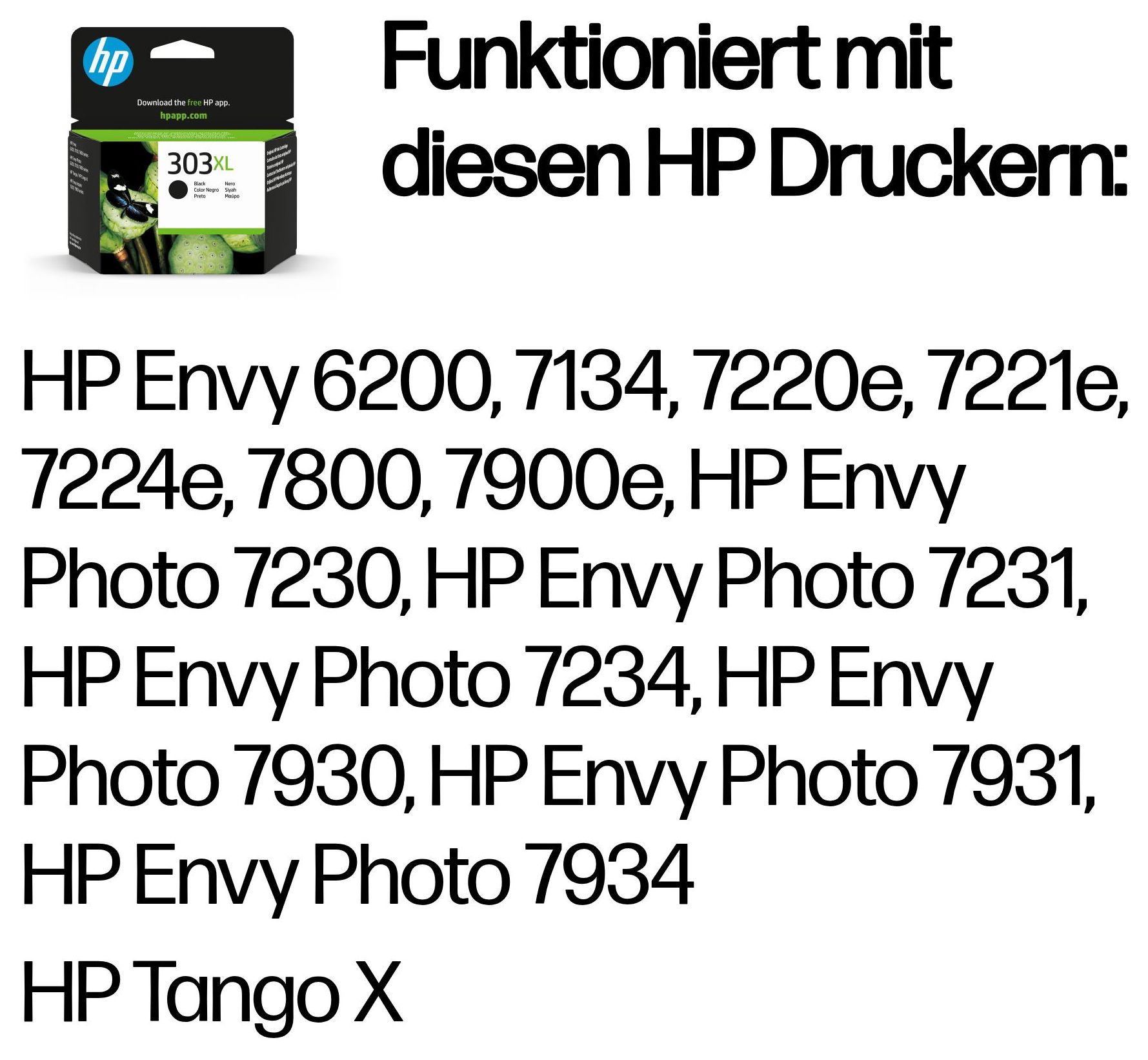 Kompatibilität HP 303 Druckerpatronen funktionieren mit: HP Envy 6200, 7134, 7220e, 7221e, 7224e, 7800, 7900e, HP Envy Photo 7230, HP Envy Photo 7231, HP Envy Photo 7234, HP Envy Photo 7930, HP Envy Photo 7931, HP Envy Photo 7934 HP Tango X