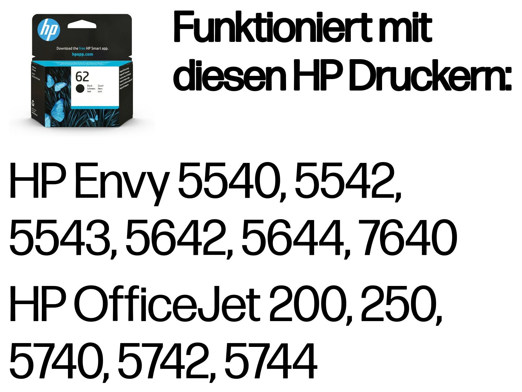 Kompatibilität HP 62 Druckerpatronen funktionieren mit: HP Envy 5540, 5542, 5543, 5642, 5644 HP OfficeJet 200, 250, 5740, 5742, 5744