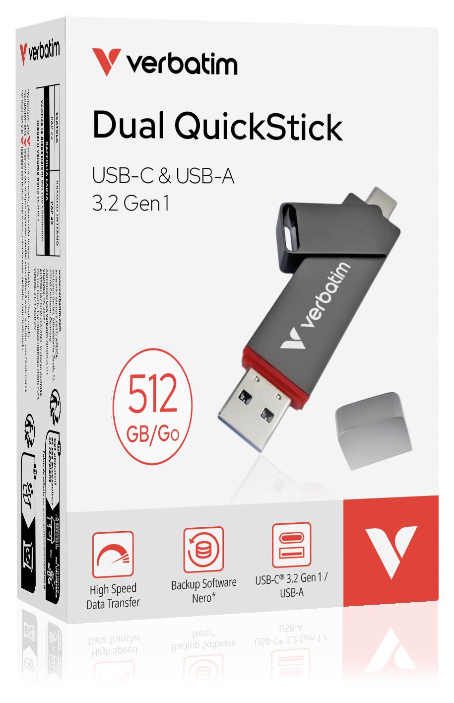 Verbatim Dual QuickStick. Kapazität: 512 GB, Geräteschnittstelle: USB Type-A / USB Type-C, USB-Version: 3.2 Gen 1 (3.1 Gen 1), Lesegeschwindigkeit: 550 MB/s, Schreibgeschwindigkeit: 500 MB/s. Formfaktor: andere. Gewicht: 32 g. Produktfarbe: Grau