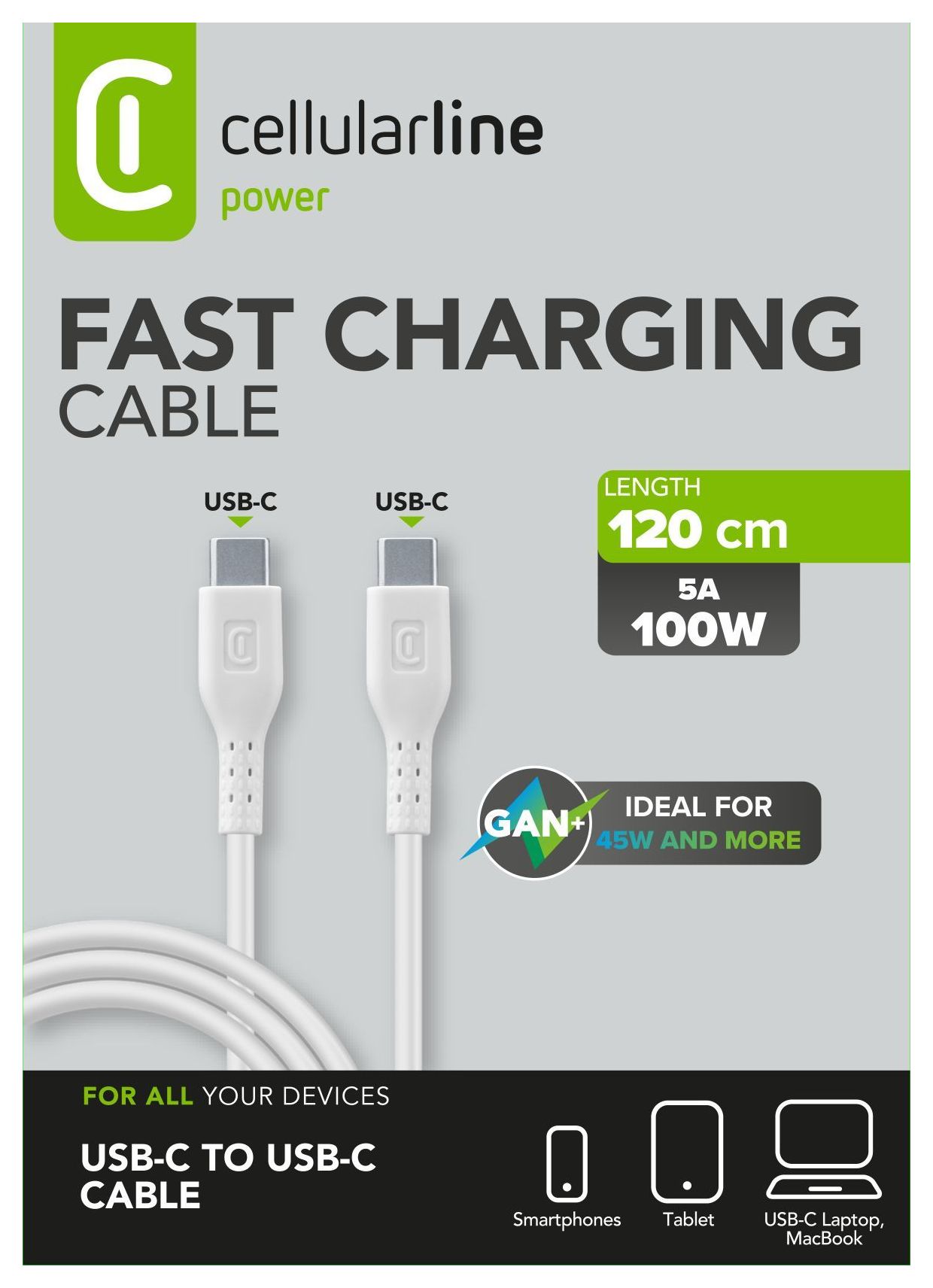 Das 120 cm lange 5A-USB-C-auf-USB-C-Kabel von Cellularline lädt mit bis zu 100W. Ideal für den täglichen Einsatz mit Smartphones, Tablets und Laptops. Kompatibel mit GaN-Ladegeräten ab 45W.