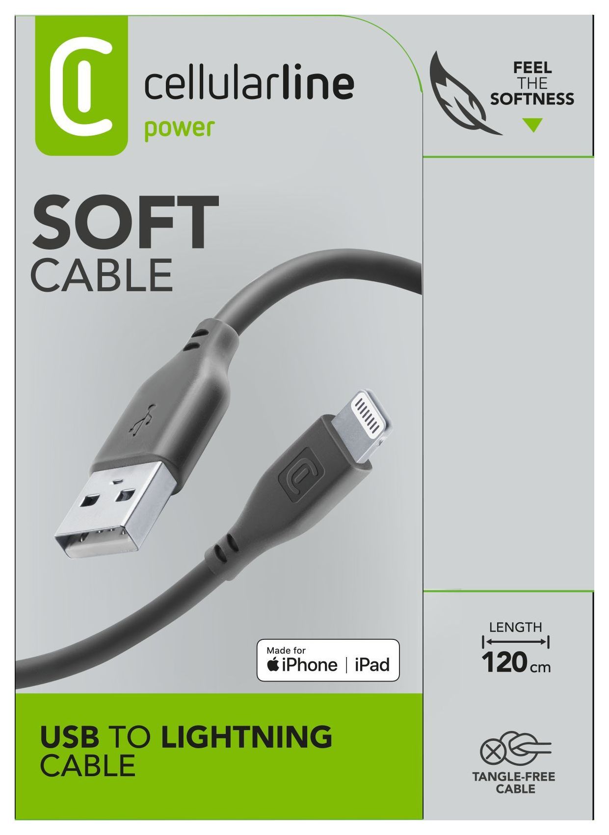 SOFT CABLE ist das erste Kabel der Cellularline-Reihe mit Silikonüberzug, wodurch es sich wunderbar weich anfühlt. So wird das Anschließen zum Genuss, und dank des Silikons ist es auch noch unverhedderbar: Knicken, Verdrehen, Biegen, all das macht ihm nichts aus, es bleibt immer frei von Knoten.