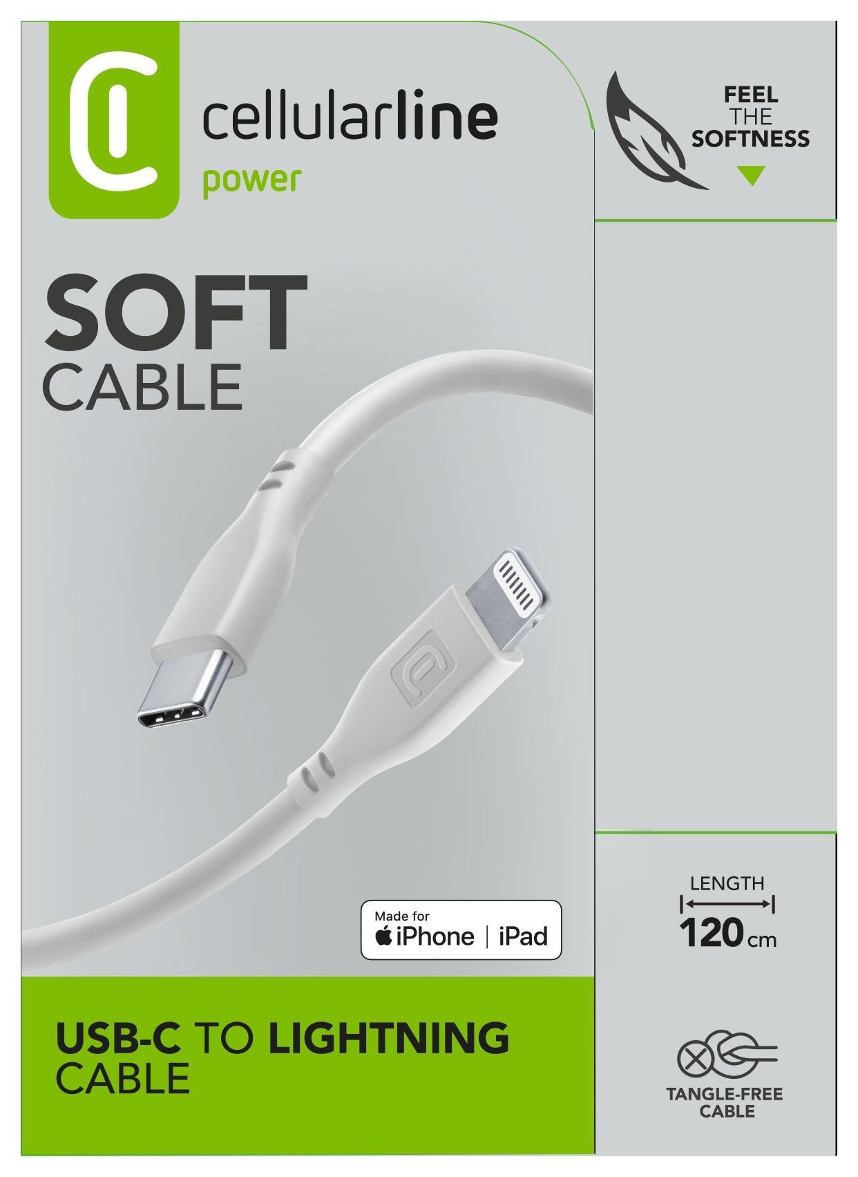 SOFT CABLE ist das erste Kabel der Cellularline-Reihe mit Silikonüberzug, wodurch es sich wunderbar weich anfühlt. So wird das Anschließen zum Genuss, und dank des Silikons ist es auch noch unverhedderbar: Knicken, Verdrehen, Biegen, all das macht ihm nichts aus, es bleibt immer frei von Knoten.