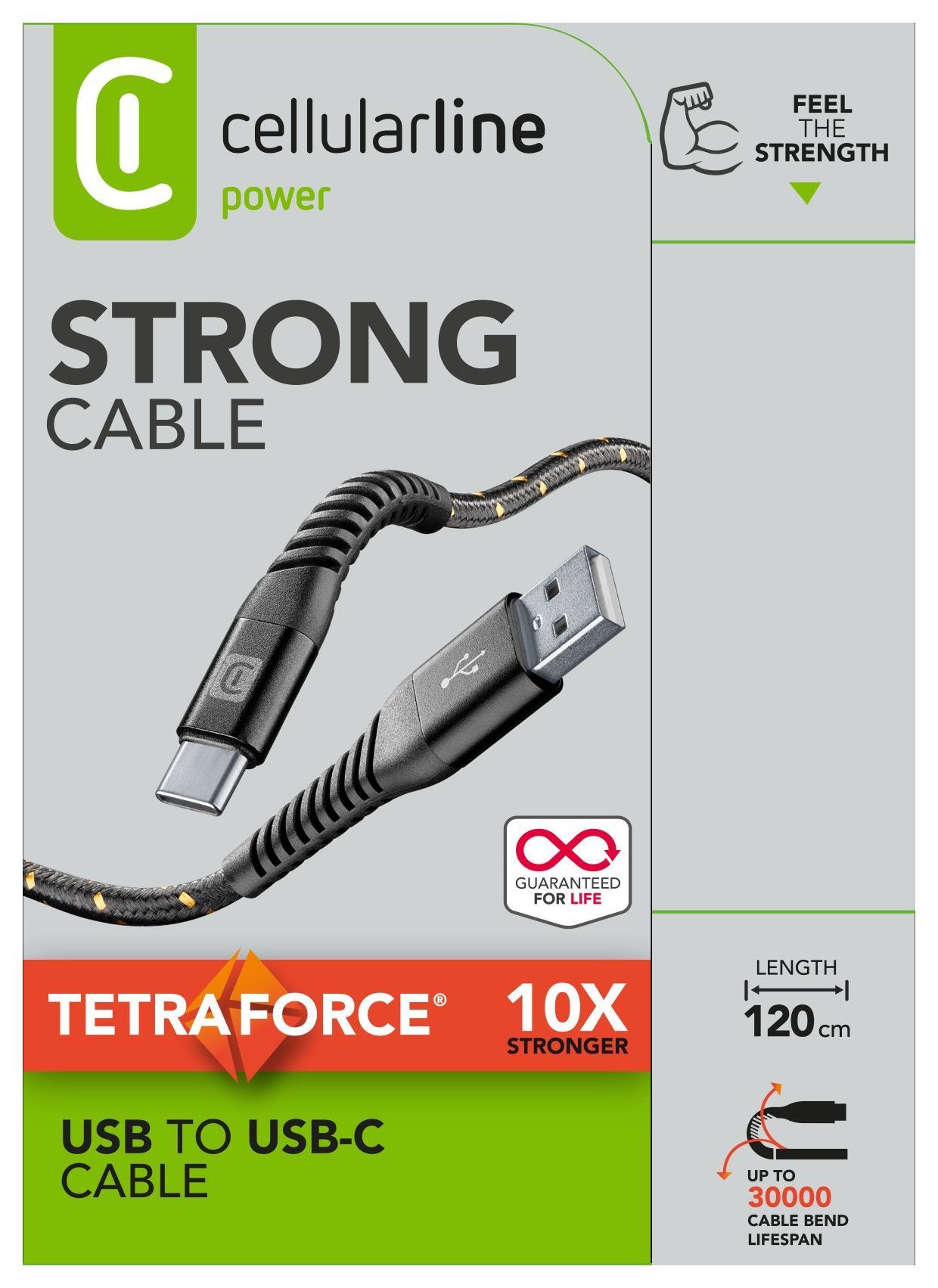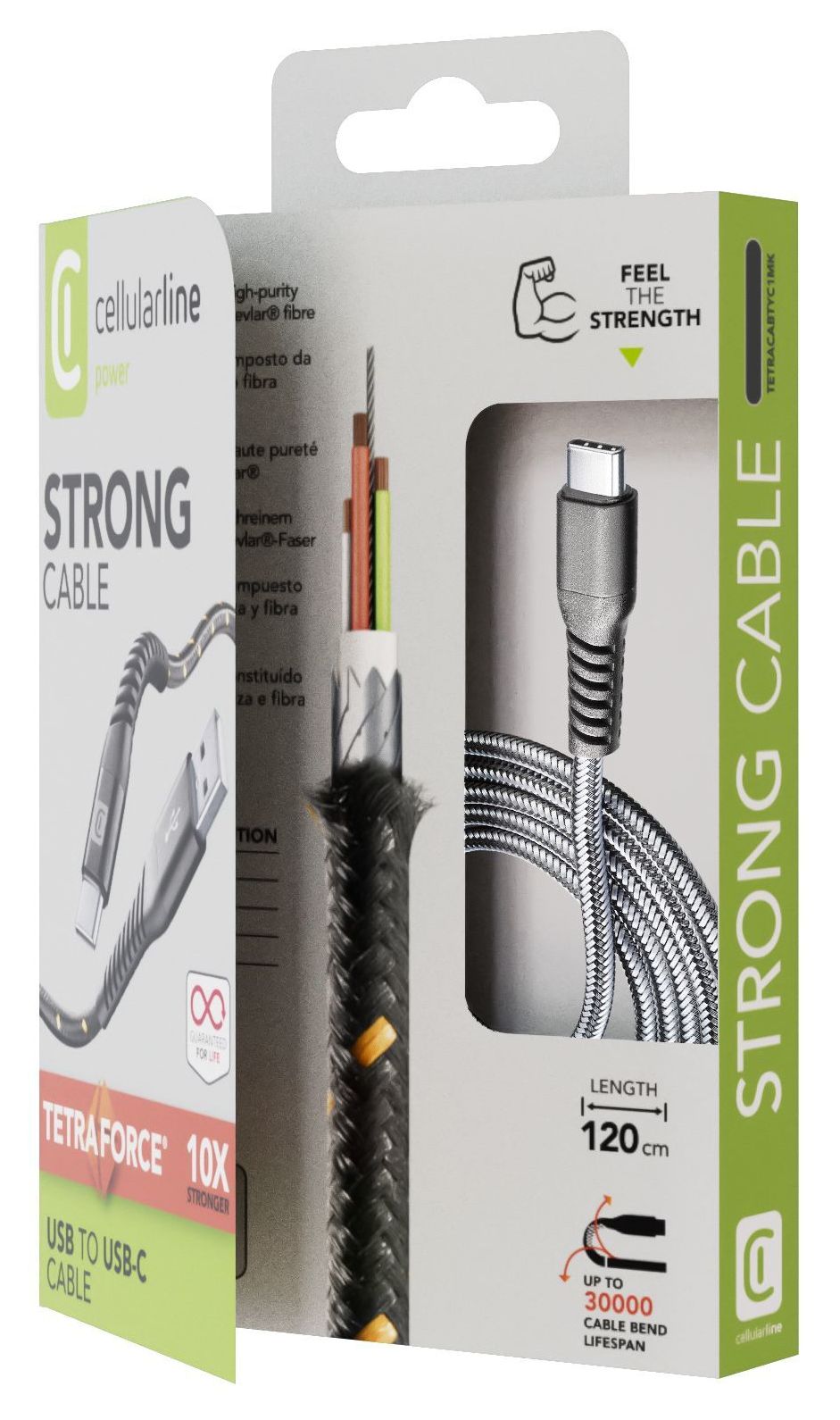 STRONG CABLE aus der TETRA FORCE-Serie ist das robusteste Kabel im Cellularline-Portfolio. Die um 30 % verlängerte Kabelführung ist mit Snake-Technologie ausgestattet und ultraflexibel sowie superrobust auch bei höchster Belastung; sie schützt den empfindlichsten Teil des Kabels und erlaubt, das Kabel bis zu 10.000-mal zu biegen – zehnmal so häufig wie bei herkömmlichen Kabeln. Die für Strong Cable verwendeten Materialien wurden für höchste Langlebigkeit entwickelt: Steckverbindungen aus Metall machen unempfindlich gegen Stöße und Druck, Kabelabdeckung mit doppeltem Geflecht aus verstärktem Stoff für extreme Flexibilität und Robustheit, Gehäuse aus Aluminiumlegierung, innerer Kern aus hochreinem Kupfer und Aramidfasern von DuPont™ Kevlar®.DuPont™ und Kevlar® sind registrierte Handelsmarken oder Handelsmarken von EI du Pont de Nemours and Company oder seinen verbundenen Unternehmen.