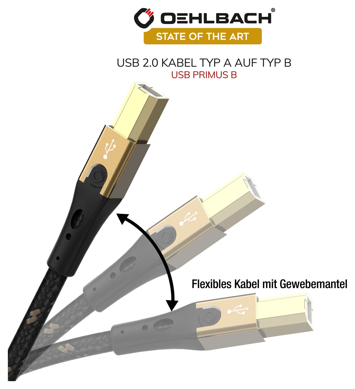 USB-Typ-B-Anschlüsse finden sich häufig bei Audio-Verstärkern, Druckern oder Scannern, Speichermedien oder Präsentationsbeamern. Bei diesem Anschlusstyp sind absolut verlässliche und verlustfreie Datenübertragungen besonders wichtig. Genau die schafft das Oehlbach USB-2.0-Datenkabel USB Primus B. Dabei können Sie den USB A-Anschluss reversibel - also beidseitig – einsetzen. Oehlbachs USB Primus B schafft mit dem USB Typ-A auf Typ-B Kabel eine State of the Art Verbindung. Diese besondere Qualität entsteht allen voran durch einen monokristallinen sauerstofffreien Innenleiter aus HPOCC-Kupfer. Unter einer dreifachen Schirmung sorgt er für uneingeschränkte Datentransfers. An den beiden Anschlüssen erhält das USB Primus B - Kabel dazu mit 24kt vergoldeten Vollmetallsteckern hundertprozentige Kontaktsicherheit. Weiterer Schutz entsteht durch den hochwertigen Gewebemantel des Kabels. Dieser verhindert ein versehentliches Abknicken und stärkt zuletzt noch deutlich die Haltbarkeit dieses Premium-Kabels.