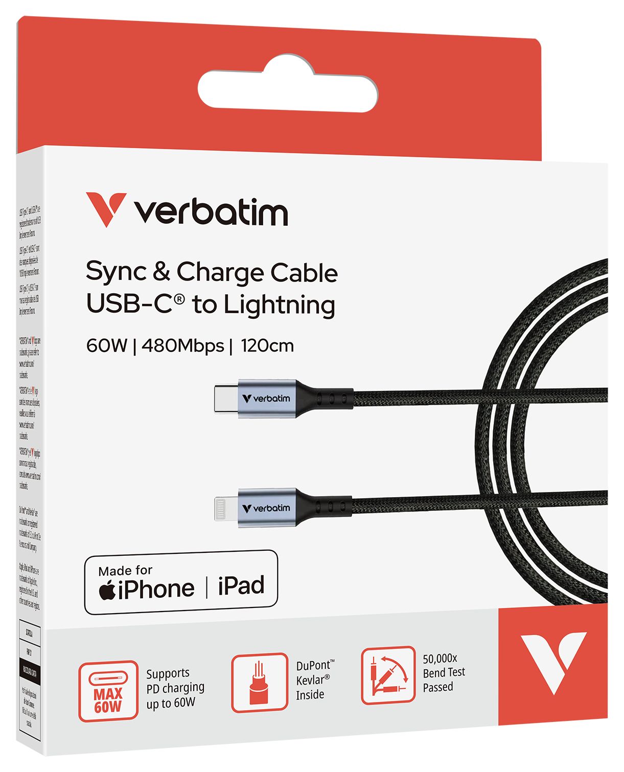 Verbatim 31844. Kabellänge: 1,2 m, Anschluss 1: Lightning, Anschluss 2: USB C. Kabeldurchmesser: 3,8 mm, Gewicht: 28 g. Menge pro Packung: 1 Stück(e), Verpackungsbreite: 85,5 mm, Verpackungstiefe: 141 mm. Lagenanzahl pro Palette: 4 Stück(e), Produkte pro Palettenlage: 1440 Stück(e)