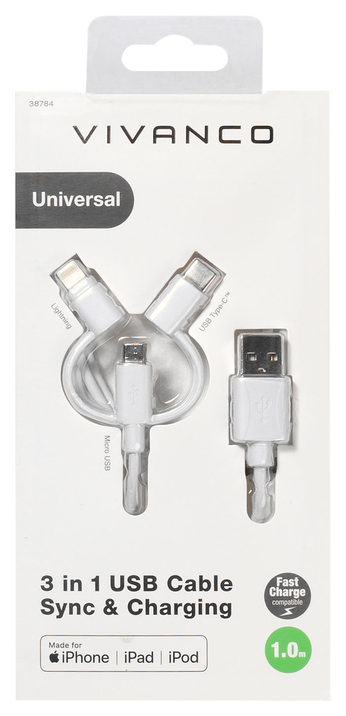 3in1 Ladekabelset, Micro USB, USB Type C™, Lightning, 1m