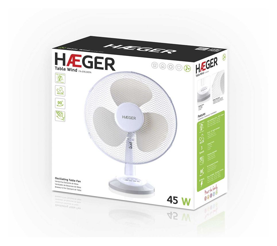 Haeger FA-016.007A. Typ: Haushalts-Lamellenlüfter, Produktfarbe: Weiß, Platzierung: Tisch. Energiequelle: AC, Stromverbrauch (Standardbetrieb): 45 W, AC Eingangsspannung: 220 - 240 V. Verpackungsbreite: 435 mm, Verpackungstiefe: 195 mm, Verpackungshöhe: 440 mm