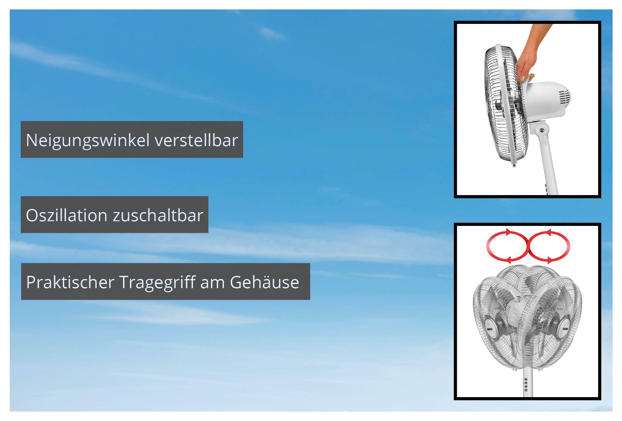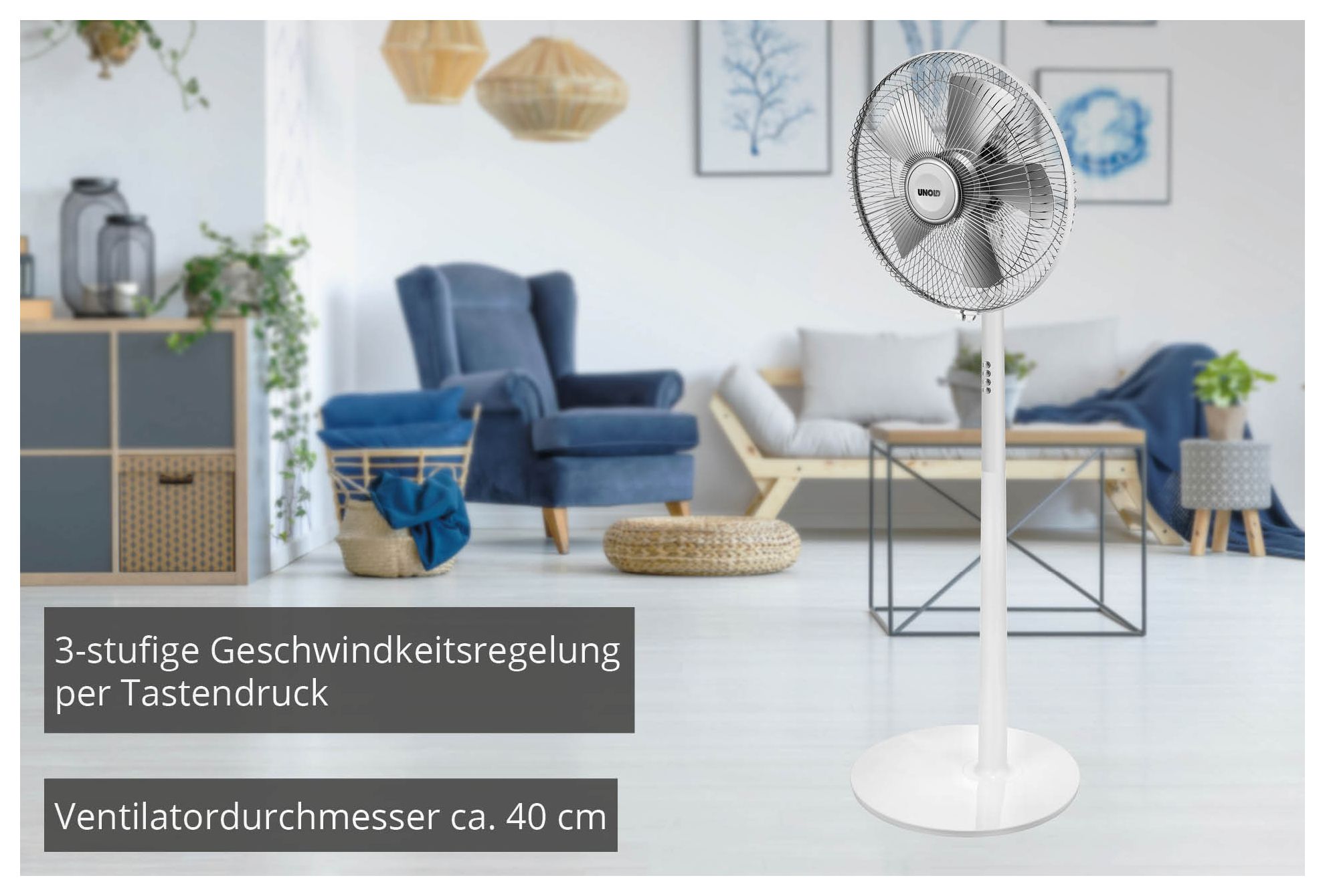 Durch die zuschaltbare Oszillation ist eine perfekte Luftzirkulation gewährleistet. Der verstellbare Neigungswinkel bringt die erfrischende Brise dorthin, wo sie benötigt wird. Mit 40 Zentimetern Durchmesser und den fünf Rotorflügeln ist es ein funktionstüchtiges Kraftpaket. Durch den praktischen Tragegriff am Gehäuse und das 185 Zentimeter lange Kabel ist die Mobilität gewährleistet, mit der frische Luft in verschiedenste Wohnräume geliefert werden kann. Hintragen, Stecker in die Steckdose, Taste drücken und los geht’s!