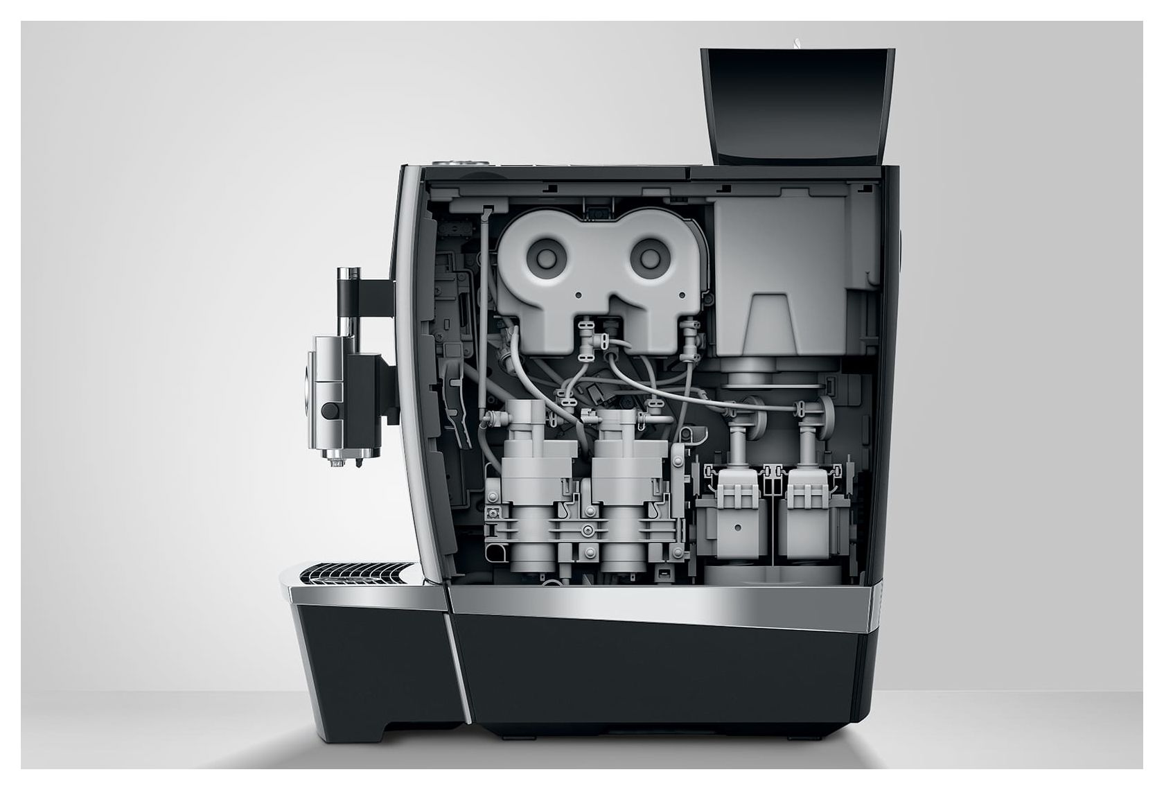 Hygiene ist bei Maschinen mit Milchfunktion ein zentrales Thema. JURA nutzt hier das AutoClean-System, das die Leitungen eigenständig spült und so Ablagerungen verhindert. Da die Milch direkt über eine Leitung zugeführt wird, entfällt das Hantieren mit internen Behältern. Das Gehäuse aus Aluminium und schwarzem Kunststoff wirkt dabei nicht nur stabil, sondern ist auch unempfindlich gegenüber Fingerabdrücken. Aber auch die inneren Werte zählen: Der maximale Betriebsdruck von 15 bar presst das Wasser mit genau der richtigen Kraft durch das Pulver.