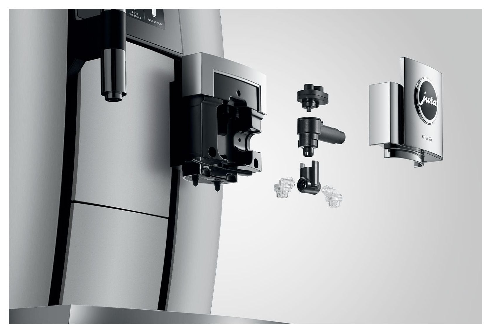 Genauso einfach, logisch und intuitiv wie die Bedienung funktioniert die Pflege der GIGA X3c. Original Pflegeprodukte von JURA sowie integrierte Spül- und Reinigungsprogramme sorgen für TÜV-zertifizierte Hygiene auf Knopfdruck. Ebenso durchdacht präsentiert sich die Milchsystemreinigung. Vollautomatisch und per Touch aufs Display gestartet, garantiert sie perfekte Sauberkeit im Umgang mit Milch. Der massive Kombiauslauf lässt sich mit wenigen Handgriffen zerlegen. Die darin vorn angeordneten Milchausläufe sind bequem zugänglich und können bei Bedarf ganz einfach ersetzt werden.