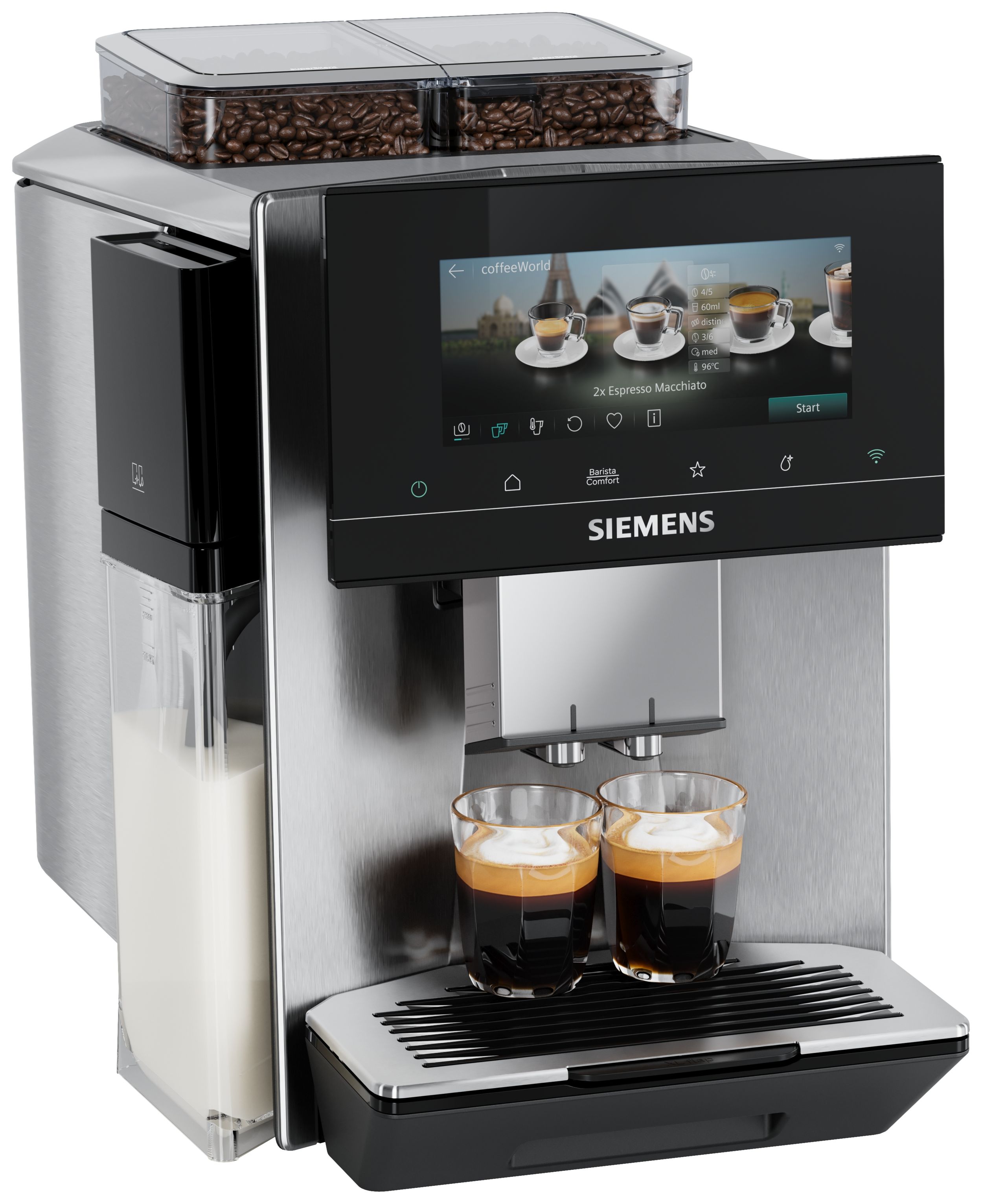 - Schnelle Auswahl von Klassikern wie Cappuccino oder Latte Macchiato über das Touch-Display.