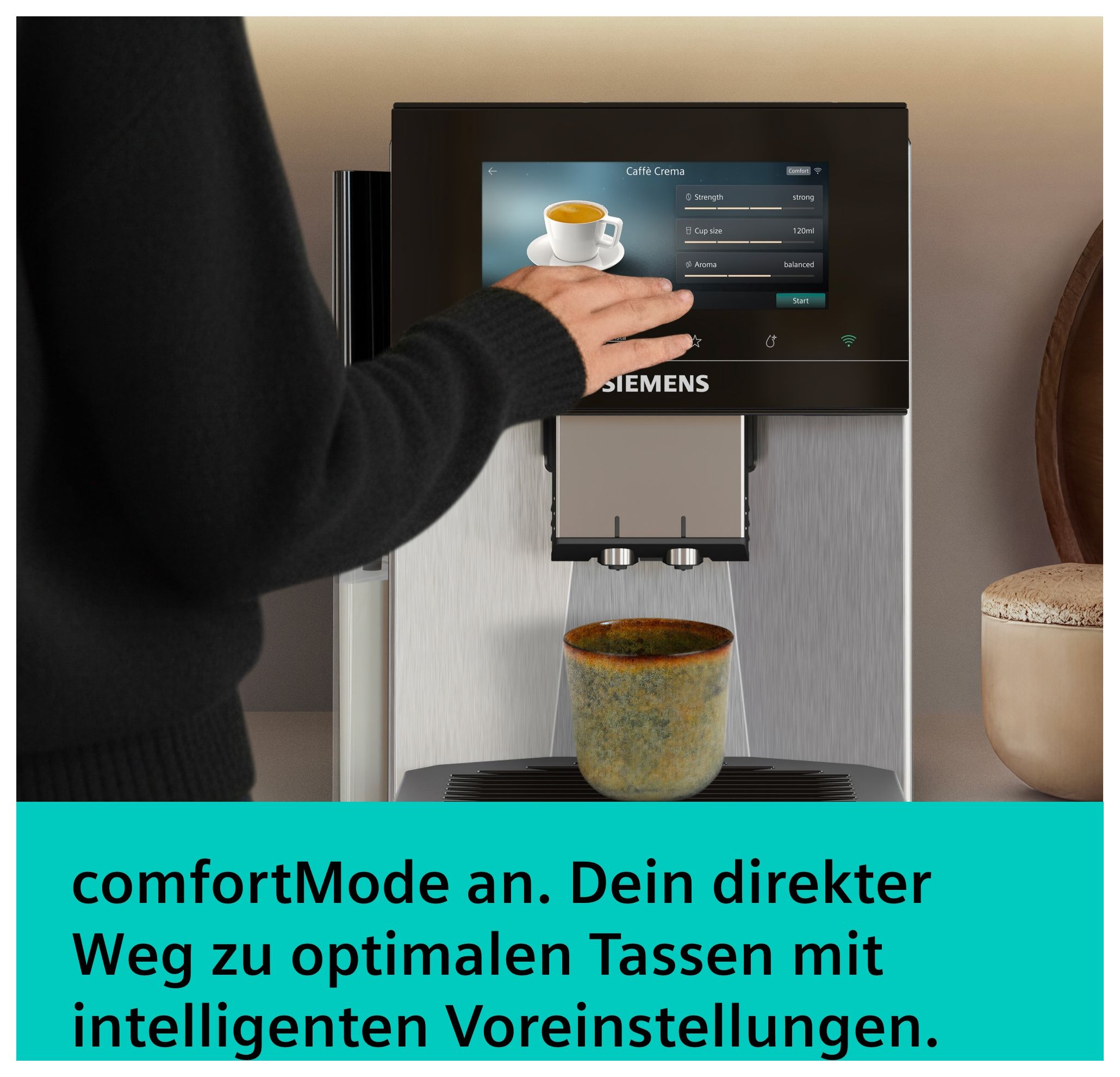 Intuitive Bedienung par excellence – Made by Siemens. Noch nie war es so einfach, deinen Kaffee auf deinen persönlichen Geschmack und deine Vorlieben abzustimmen. Mit dem iSelect Display und seiner Touch&Slide-Funktion ist es unglaublich einfach, deinen Kaffee nach deinen bevorzugten Geschmacksnuancen zu personalisieren.
