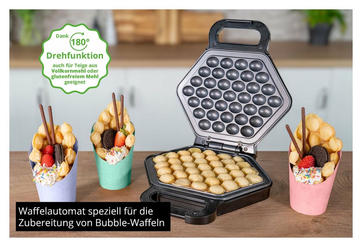 Kommt da nicht der feine Duft frisch gebackener Waffeln aus der Küche? Überraschen Sie Freunde und Familie mit den typischen Bubble-Waffeln, wie man sie von Jahrmärkten her kennt! Dank 700 W Power, hochwertiger Antihaftbeschichtung und automatischer Temperaturregelung erhalten Sie von WAFFLEMAKER Bobby Ihre Waffeln immer im gewünschten Bräunungsgrad – außen knusprig, innen luftig! Außerdem lässt sich das Waffeleisen um 180° wenden – der Teig verteilt sich gleichmäßig und die Waffeln sehen fertig gebacken mit der perfekten Wabenstruktur einfach zum Anbeißen aus. Rollen Sie die Bubble-Waffeln wie eine Eistüte zusammen – sie bleiben nach dem Abkühlen in dieser Form und können herzhaft oder süß befüllt werden, fertig ist der vollendete Waffelgenuss!