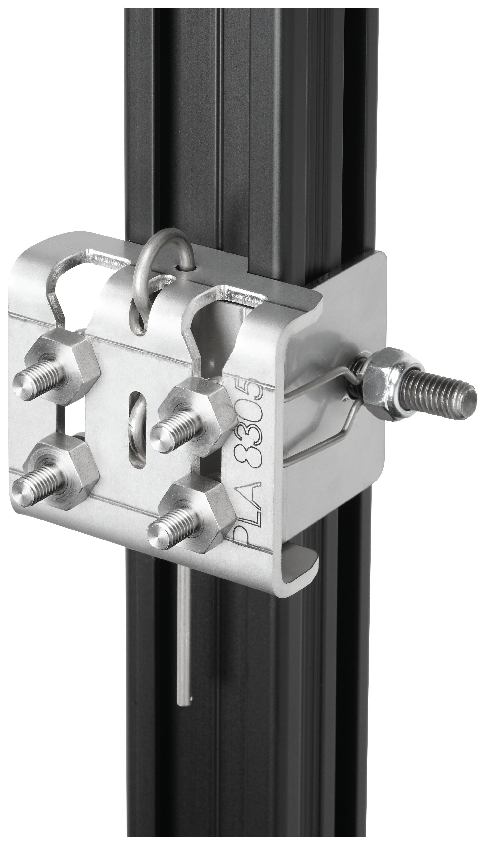 Das PLA 8901 ermöglicht die Befestigung des maßgefertigten Adapters Mitte (PLA 83xx) auf dem Vertikalprofil (PLM 8030).