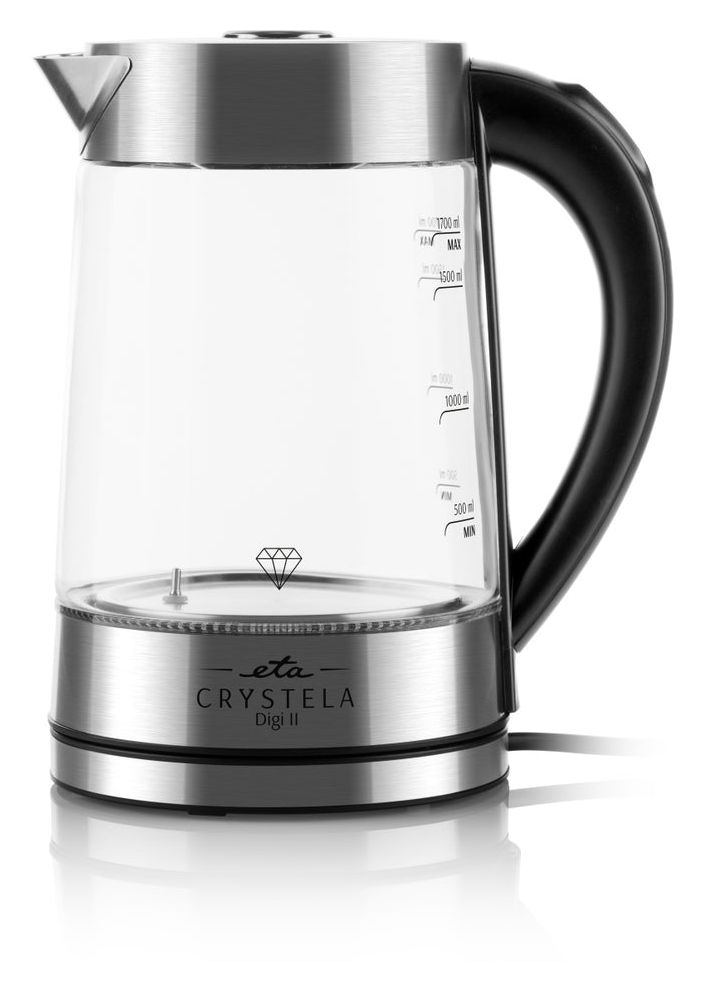 Eta Crystela Digi II, 1,7 l, 2200 W, Edelstahl, Transparent, Glas, Regelbare Temperatur, Wasserstandsanzeige