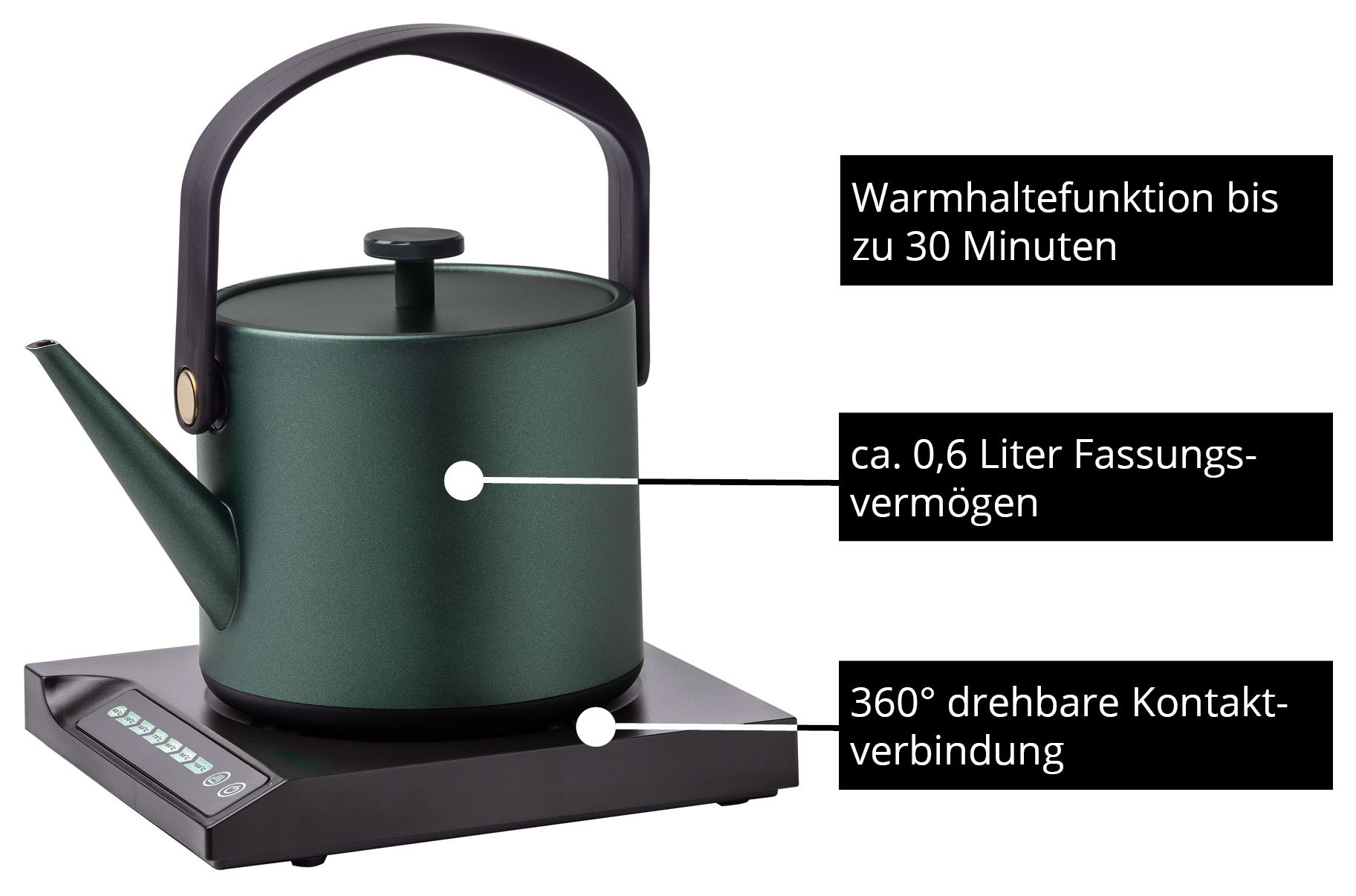 Mit sieben wählbaren Temperaturen (40 °C, 50 °C, 60 °C, 70 °C, 80 °C, 90 °C und 100 °C) ermöglicht der Blitzkocher Jade eine punktgenaue Erhitzung – ideal für verschiedene Teesorten, Babynahrung oder Instantgerichte. Die Warmhaltefunktion sorgt dafür, dass das Wasser bis zu 30 Minuten auf der gewünschten Temperatur bleibt. Für maximale Sicherheit ist der Blitzkocher mit Trockengehschutz und automatischer Abschaltung ausgestattet.