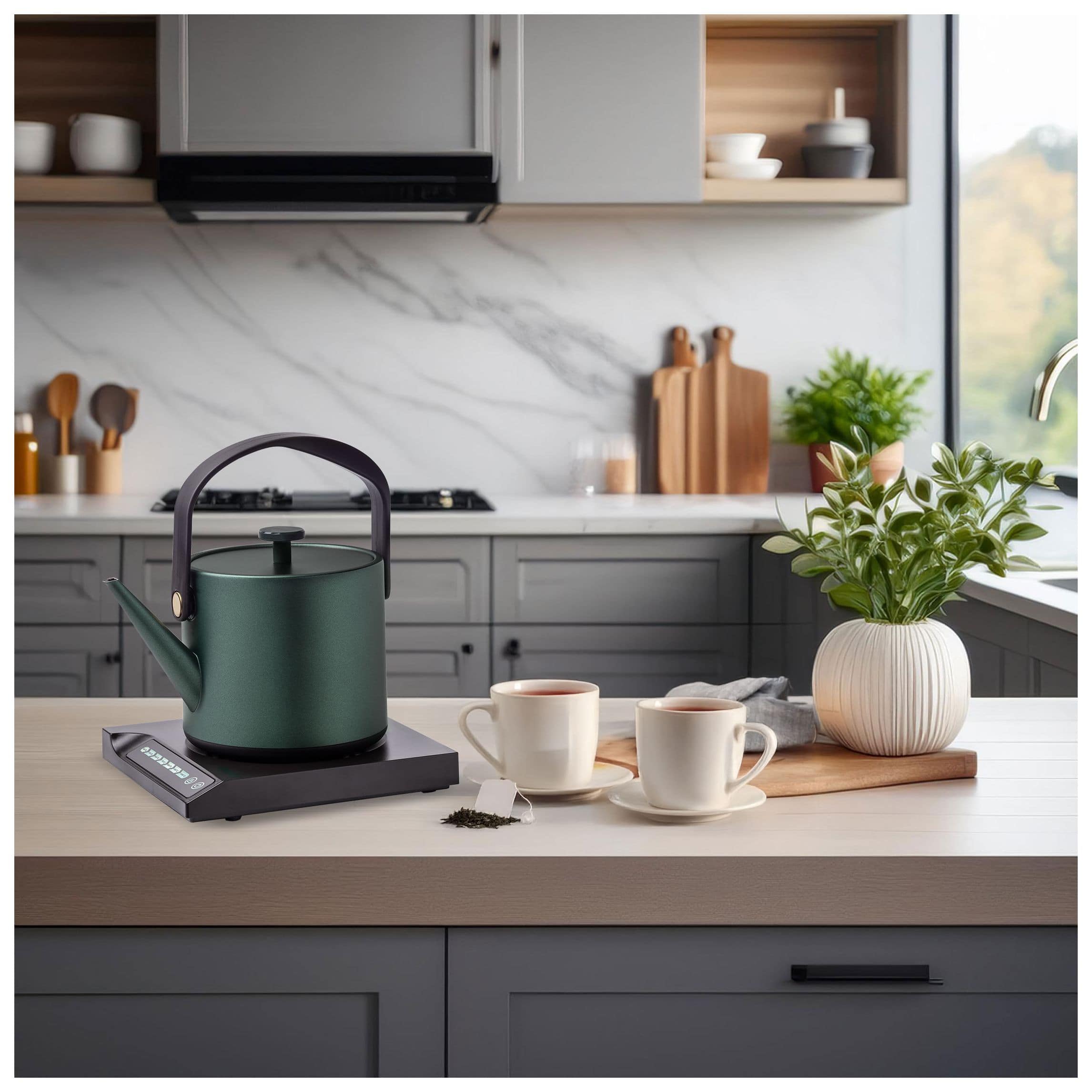 Der Blitzkocher Jade vereint modernes Design mit höchster Funktionalität. Optisch erinnert er an eine stilvolle Teekanne und fügt sich harmonisch in jede Küche ein. Sein hochwertiges Edelstahlgehäuse und das kompakte Design machen ihn zum perfekten Begleiter für Teeliebhaber und alle, die heißes Wasser in Sekundenschnelle benötigen.