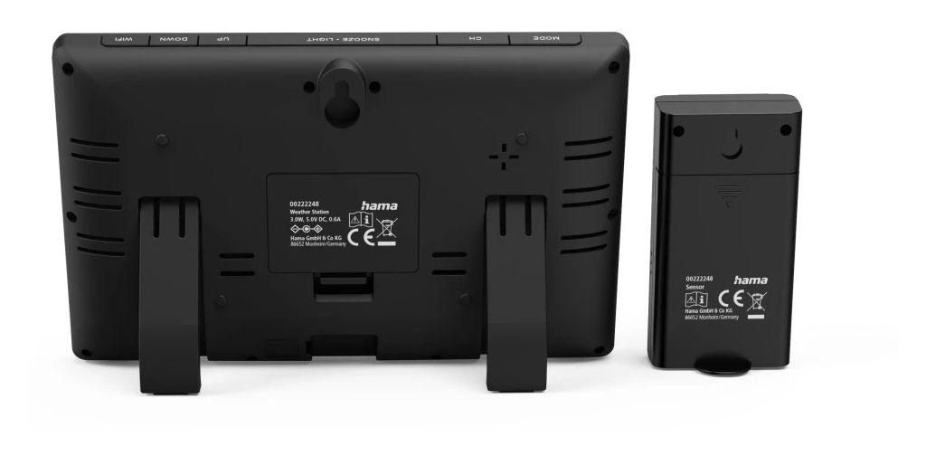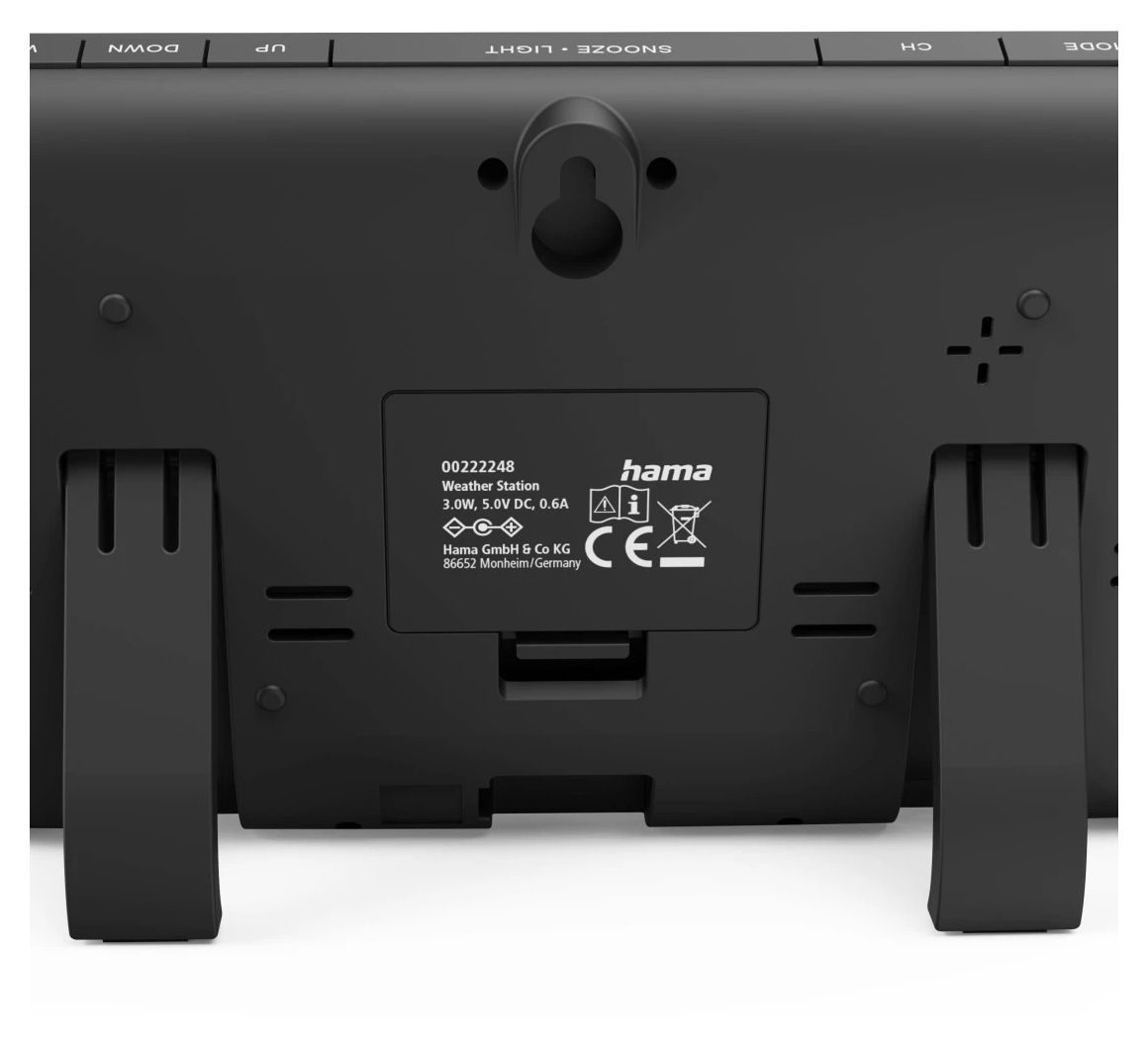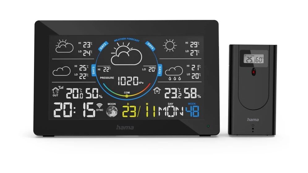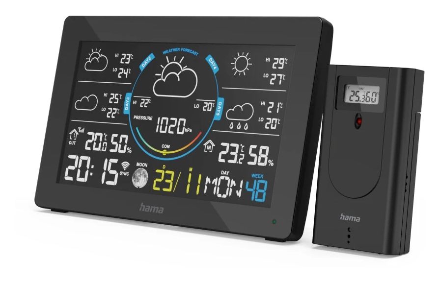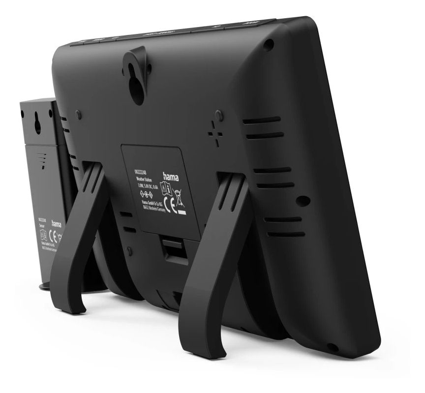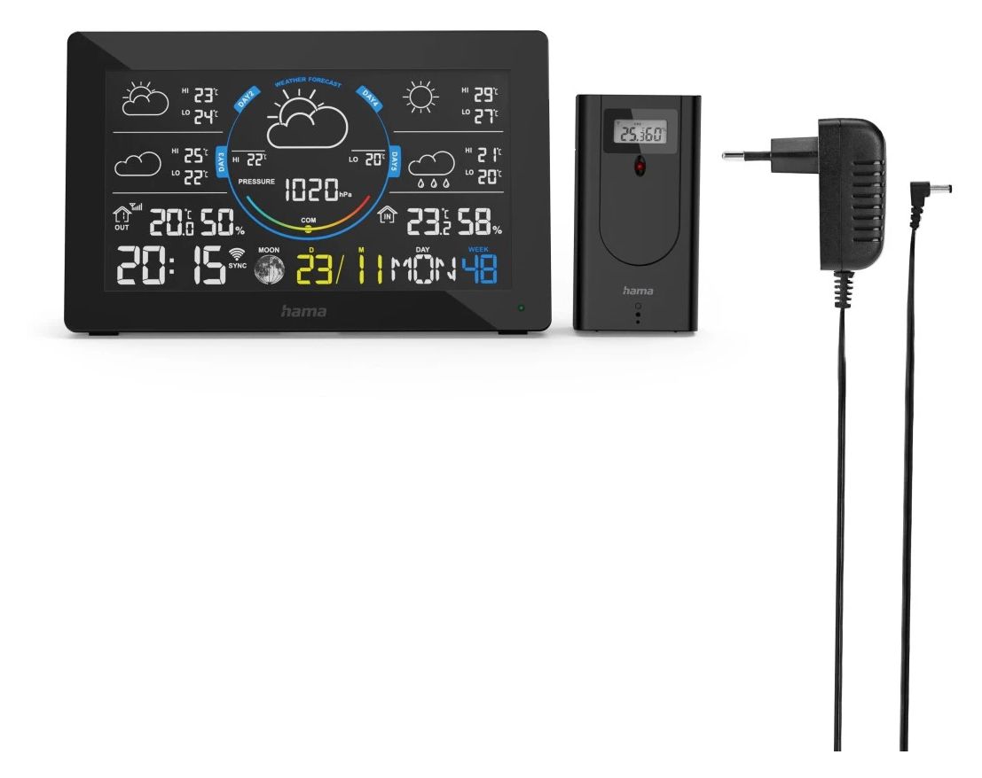 Hama 00176675. Produktfarbe: Schwarz, Messfunktionen: Innen-Thermometer, Innen-Hygrometer, Innen-Luftdruck, Außen-Barometer, Außen-Hygrometer,..., Messfunktionen Trenddisplay: Hygrometer, Thermometer. Energiequelle: DC / Batterie. Menge pro Packung: 1 Stück(e), Anzahl enthaltener Akkus/Batterien: 2 Stück(e)