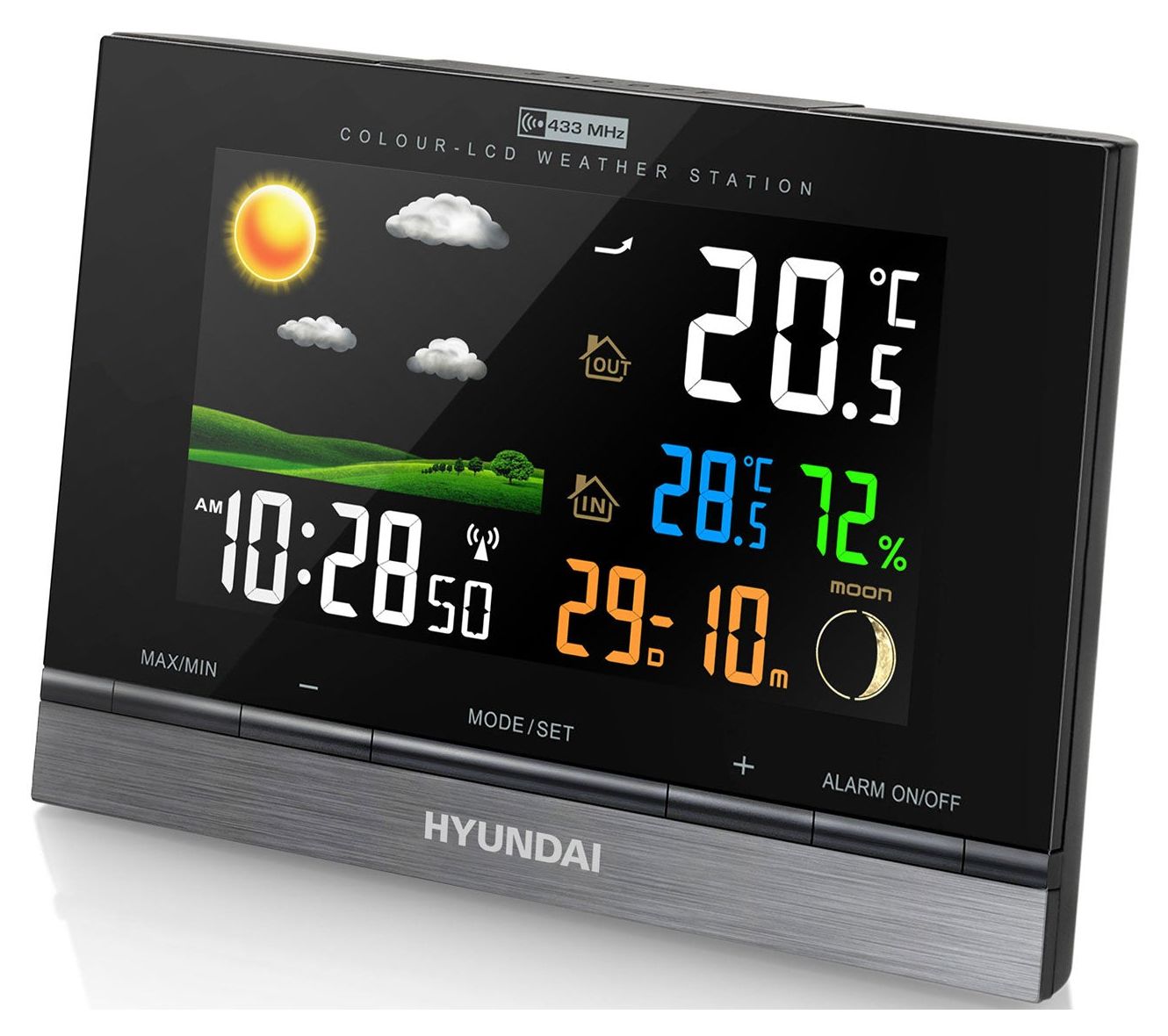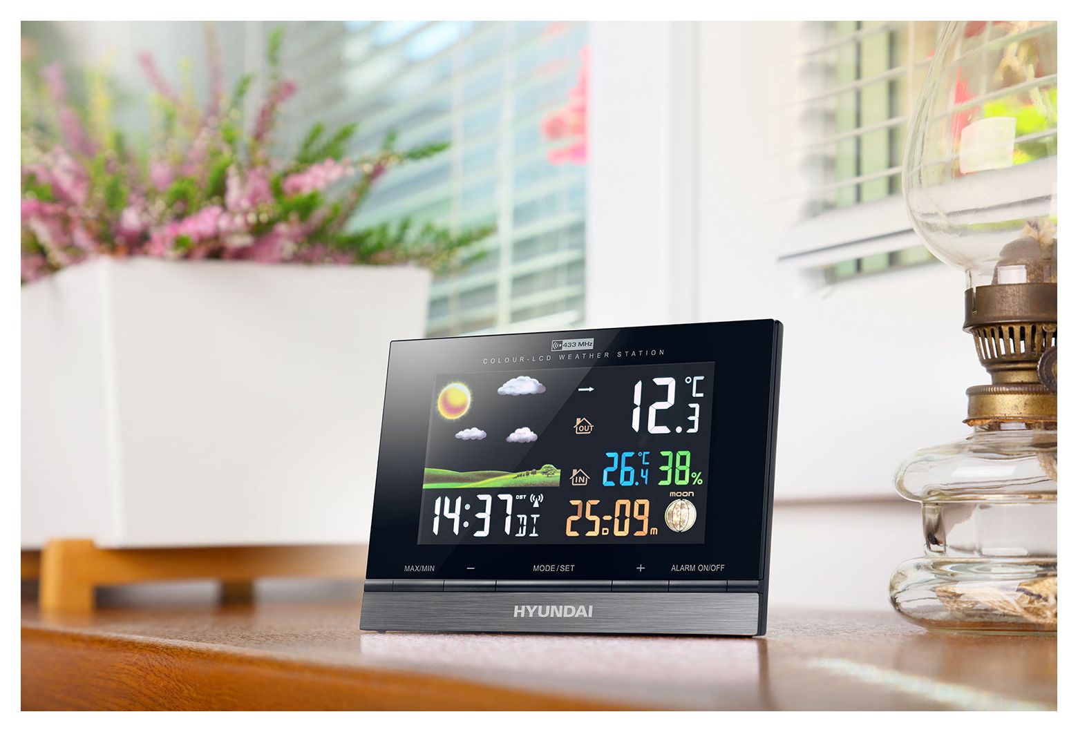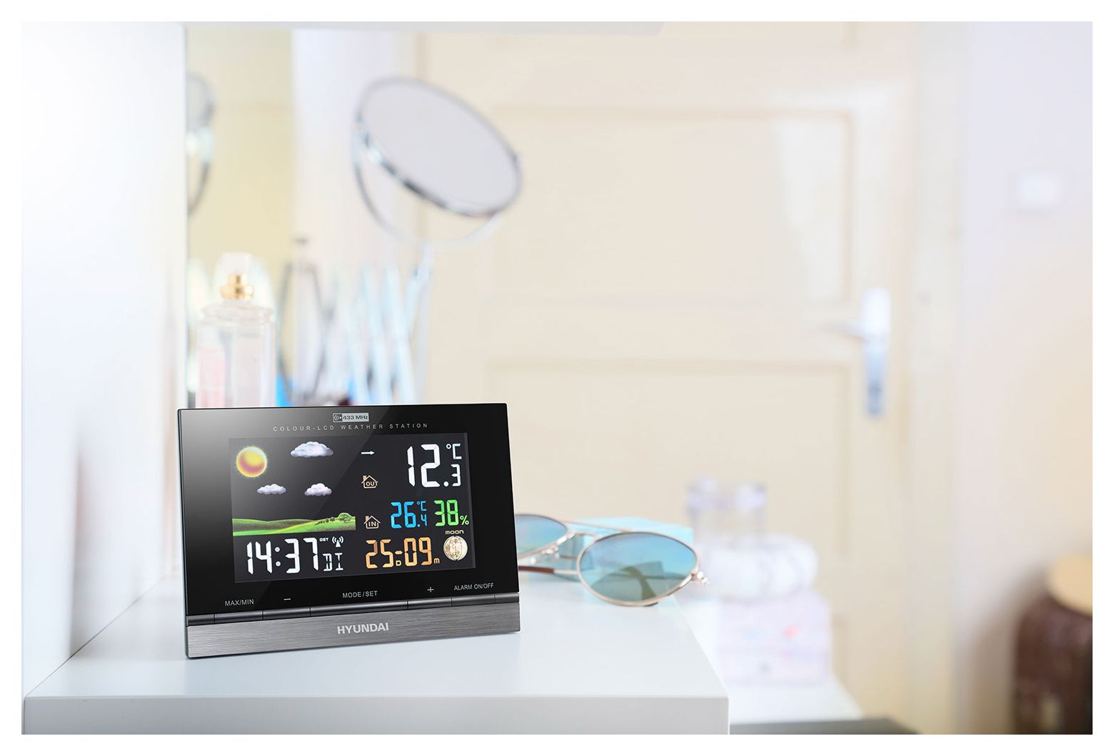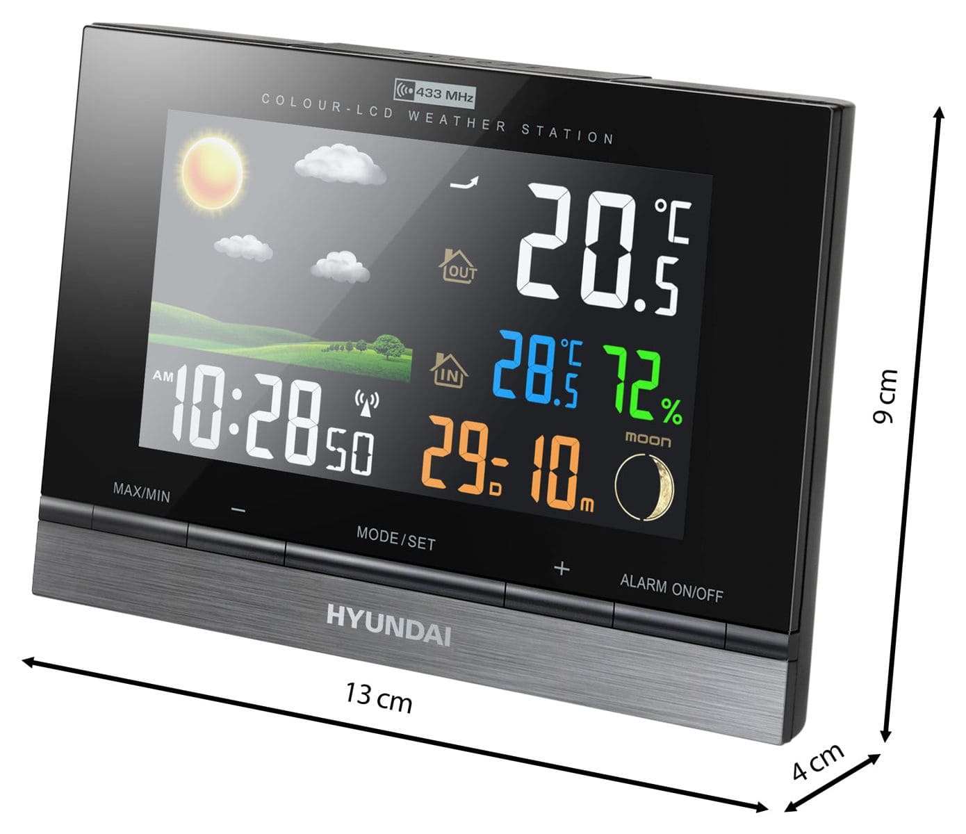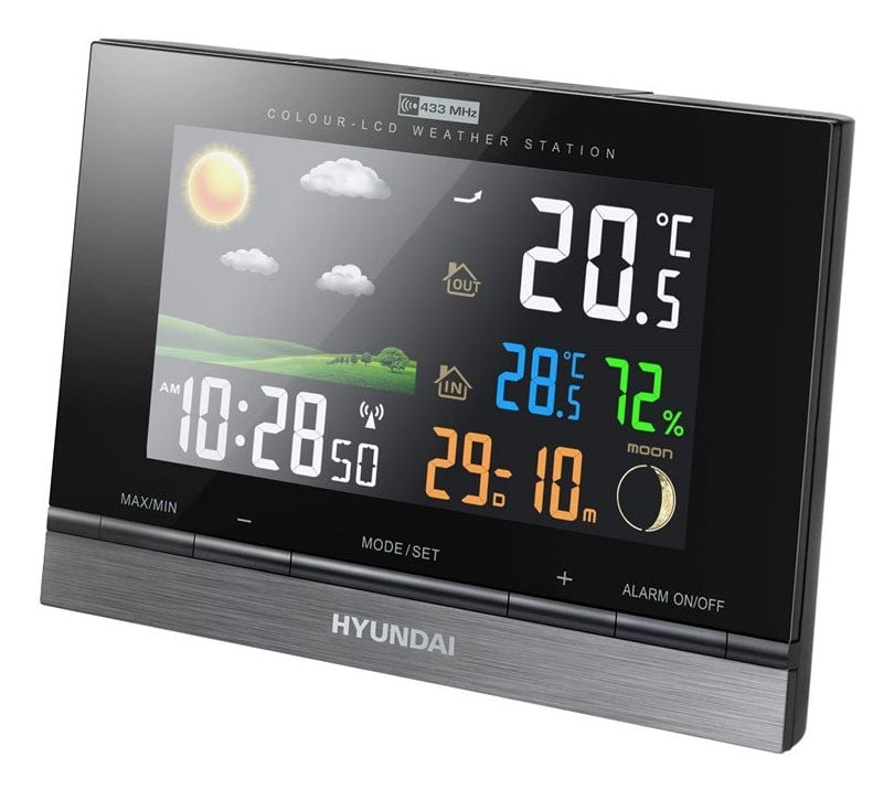 Die Hyundai WS2303 Wetterstation glänzt auf den ersten Blick durch ihre sehr schöne Verarbeitung, die von einem Metallstreifen dominiert wird. Ein weiteres unverwechselbares Element ist das klare Farb-LCD-Display. Auf diesem sind alle notwendigen Daten, die die Wetterstation anzeigt, leicht ersichtlich. Er wird schnell und einfach zu einem festen Bestandteil Ihres Büro, Wohn- oder sogar Schlafzimmer.