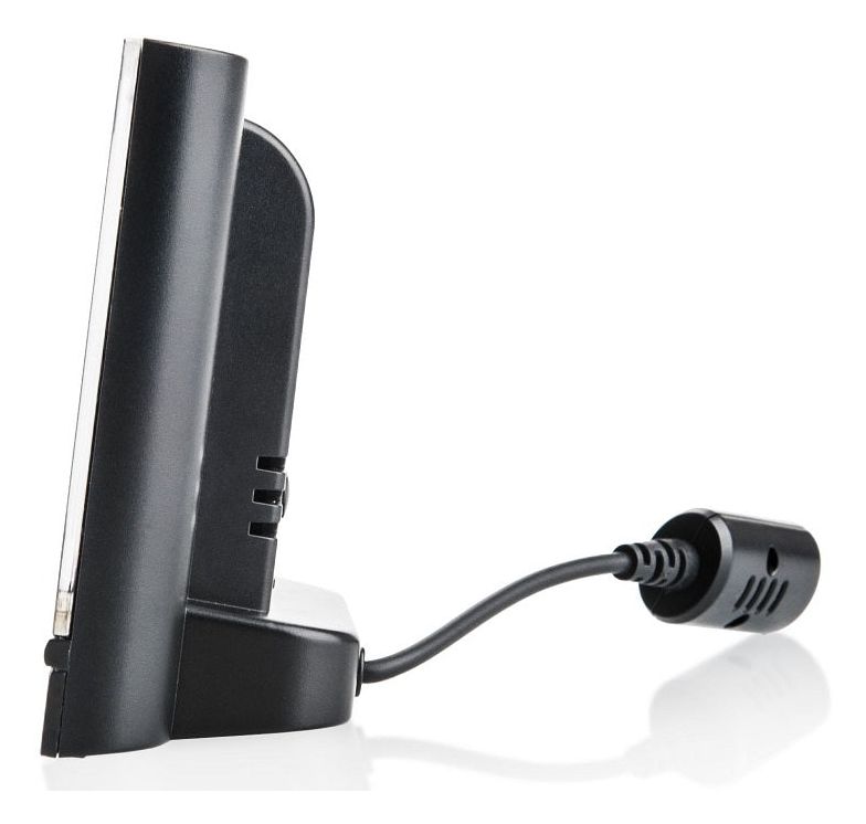 Eine weitere Funktion der Wetterstation Hyundai WS2303 ist die Anzeige der aktuellen Uhrzeit. Gesteuert wird er über das Funksignal DCF 77. Wenn Sie das Gerät in einem Kinder- oder Schlafzimmer verwenden, werden Sie auch die Alarmfunktion mit der SNOOZE-Option zu schätzen wissen. Die Wetterstation wird über ein Netzteil mit Strom versorgt. Der mitgelieferte externe Messsensor wird mit zwei 1,5 V AAA-Batterien betrieben.