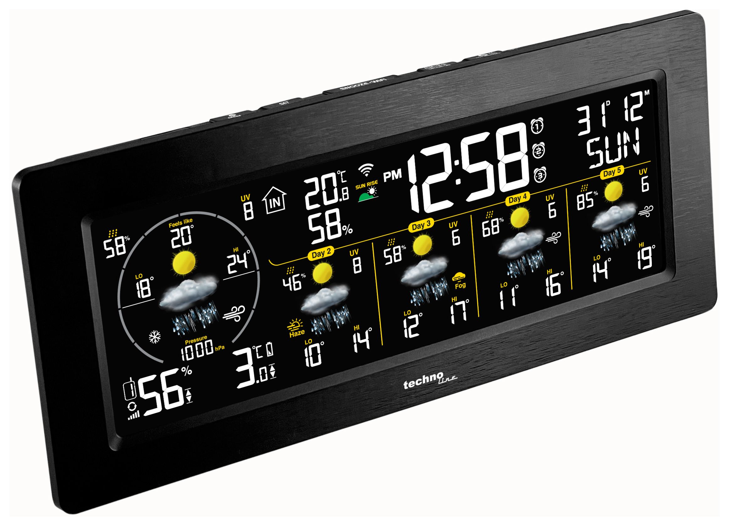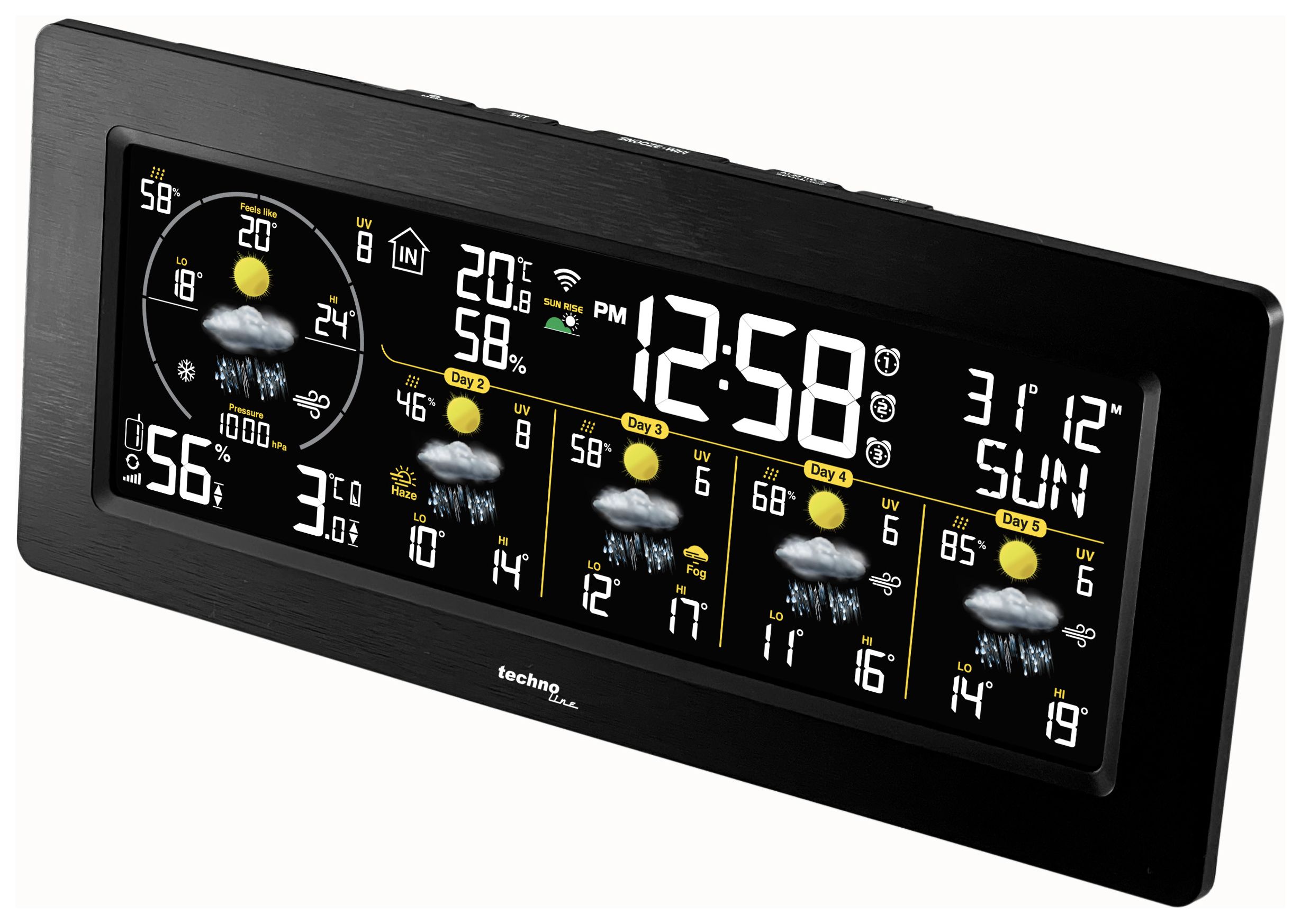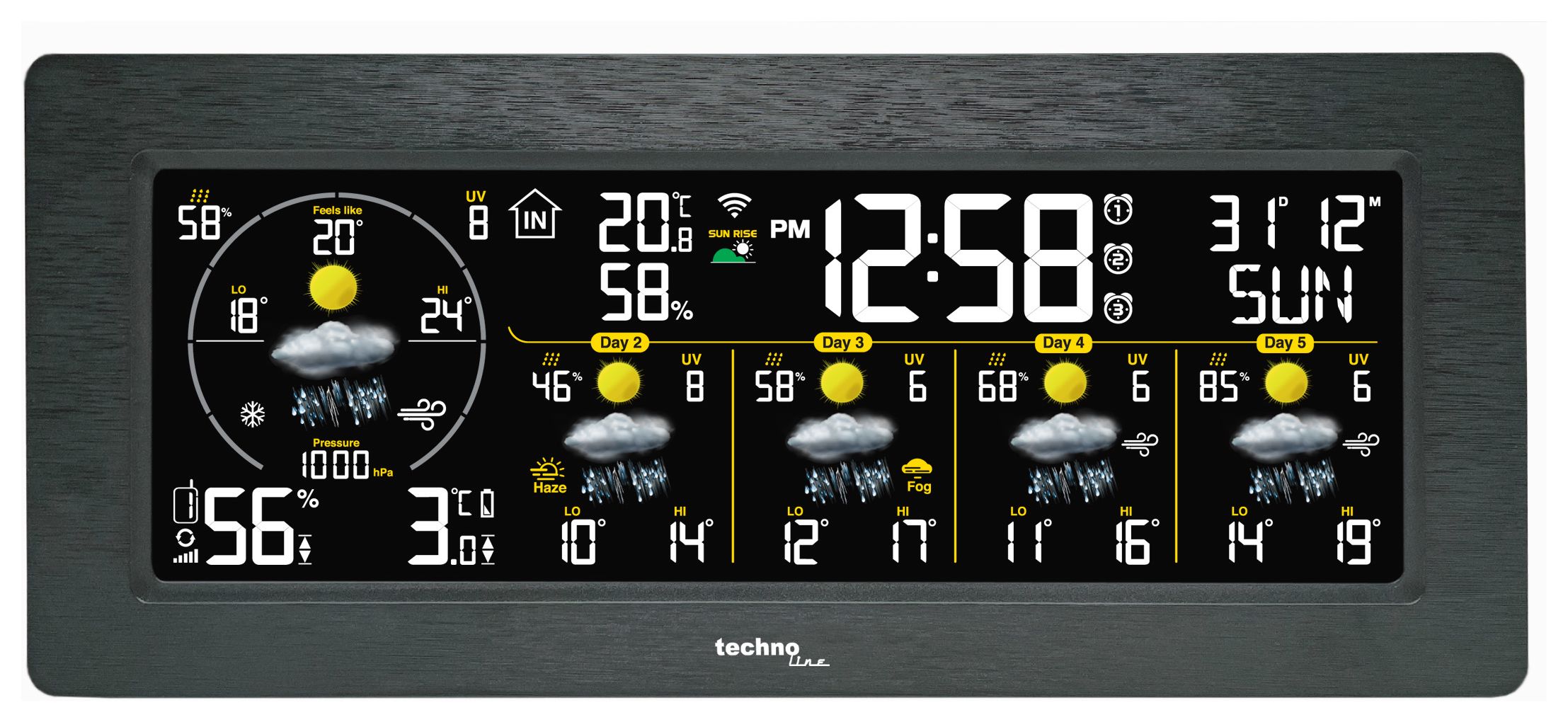 Technoline WD 3050. Produktfarbe: Schwarz, Messfunktionen: Innen-Thermometer, Außen-Thermometer, Innen-Hygrometer, Außen-Hygrometer, Regenfall,..., Messfunktionen Trenddisplay: Thermometer, Hygrometer, Barometer, Regenfall, UV. Energiequelle: Wechselstrom/Batterie, Akku-/Batterietyp: AAA Micro (LR03). Breite: 233 mm, Tiefe: 47 mm, Höhe: 100 mm. Verpackungsbreite: 111 mm, Verpackungstiefe: 245 mm, Verpackungshöhe: 76 mm. Menge pro Packung: 1 Stück(e)