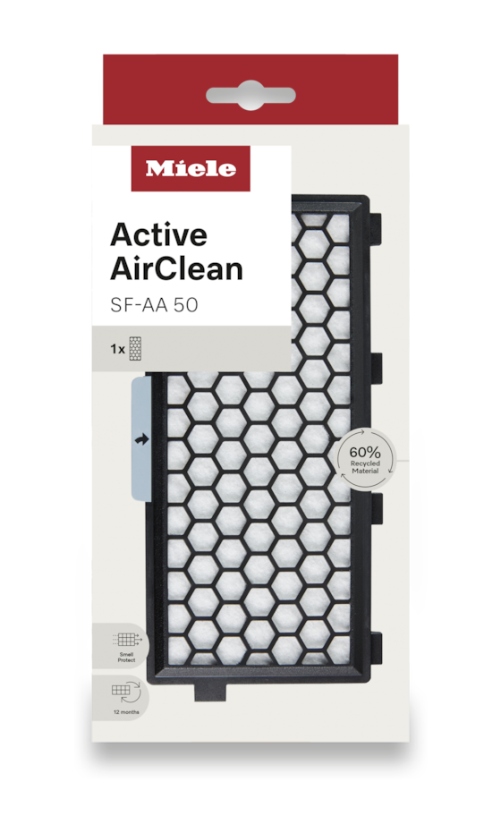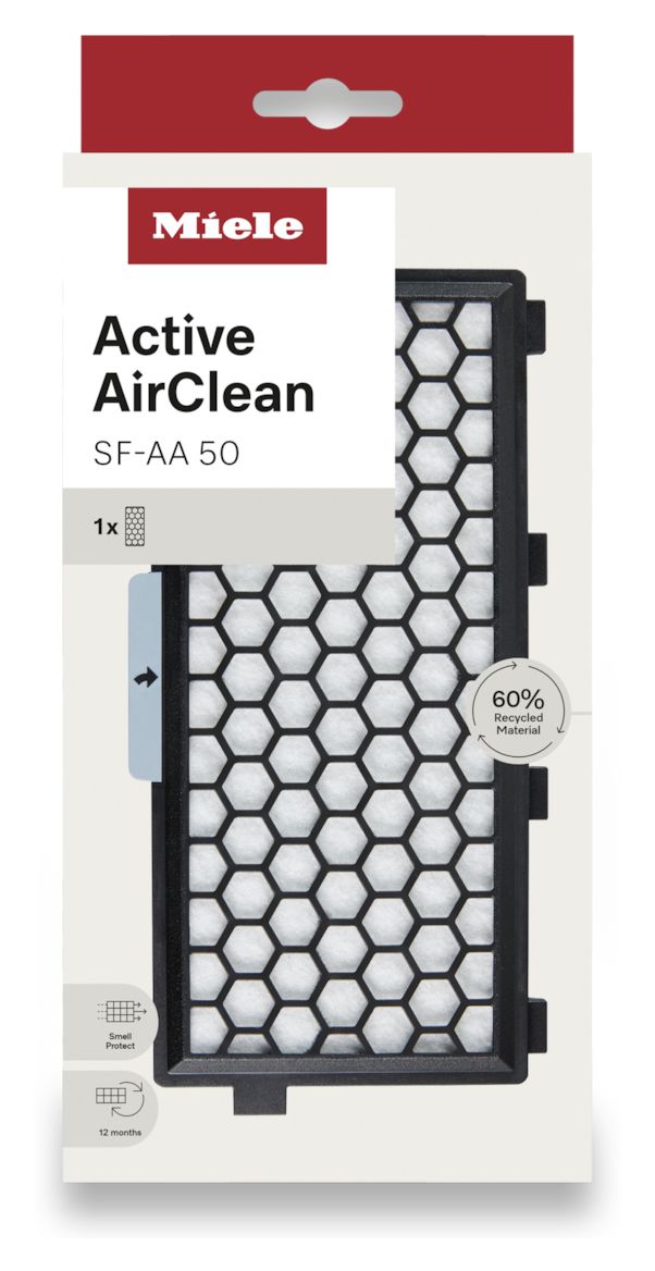 Miele SF-AA 50-1. Produkttyp: Filter, Geeignet für Staubsauger-Typ: Zylinder-Vakuum, Produktfarbe: Schwarz, Grau, Weiß. Gewicht: 150 g. Verpackungsart: Karton mit Aufhänger. Menge pro Packung: 1 Stück(e)
