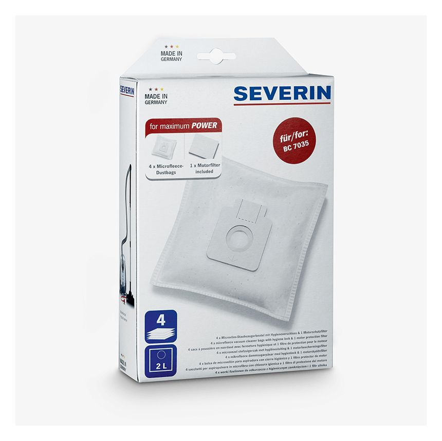 Severin SB 7211. Produkttyp: Staubbeutel, Geeignet für Staubsauger-Typ: Zylinder-Vakuum, Produktfarbe: Weiß. Breite: 180 mm, Tiefe: 48 mm, Höhe: 135 mm. Verpackungsart: Box, Verpackungsbreite: 231 mm, Verpackungstiefe: 52 mm. Menge pro Packung: 4 Stück(e)