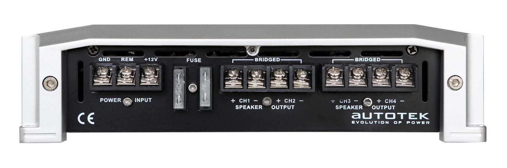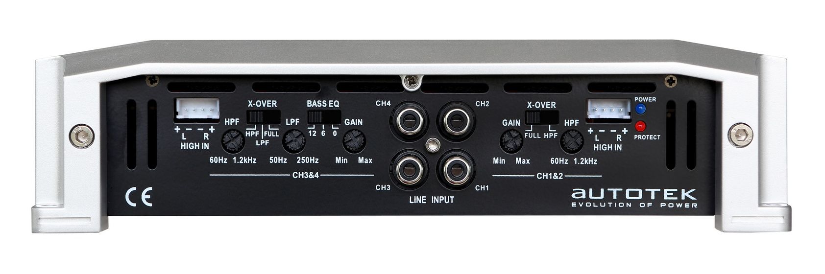 Autotek TA4150. Verstärkerklasse: A/B, Anzahl der Verstärkerkanäle: 4 Kanäle, Leistungshöhepunkt pro Kanal: 250 W. Lautsprecher-Konnektivitätstyp: RCA. Hochpass- & Tiefpass-Filterneigung: 12 dB/Oktave, Produktfarbe: Schwarz, Grau. DC input Spannung: 9 - 15 V. Breite: 223 mm, Tiefe: 300 mm, Höhe: 63 mm