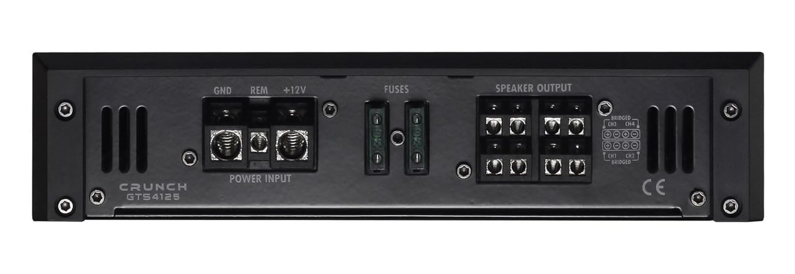 Crunch GTS4125. Verstärkerklasse: D, Anzahl der Verstärkerkanäle: 4 Kanäle, Leistungshöhepunkt pro Kanal: 500 W. Lautsprecher-Konnektivitätstyp: RCA. Produktfarbe: Schwarz. Breite: 230 mm, Tiefe: 328 mm, Höhe: 53 mm