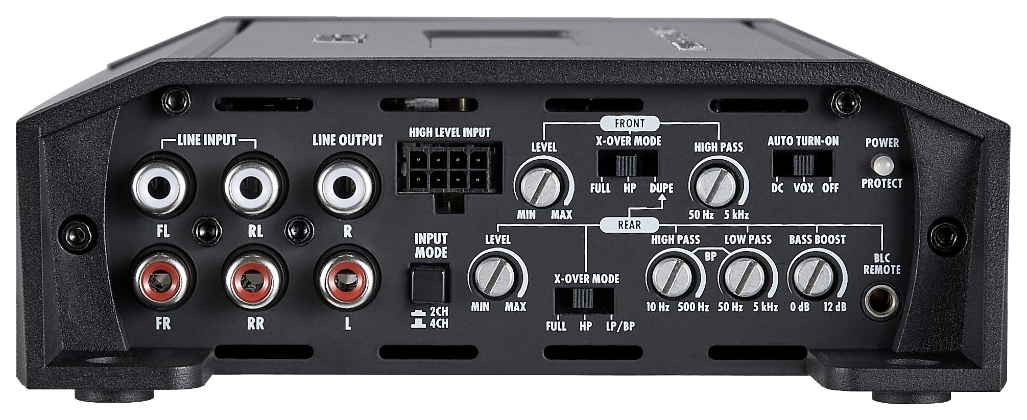 Class D Digital 4-Kanal Verstärker, 4 x 135/225 W/RMS @ 4/2 Ω, 2 x 450 W/RMS @ 4 Ω gebrückt, HPF 50 - 5000 Hz, Bass Boost 0 - 12dB, Bandpass