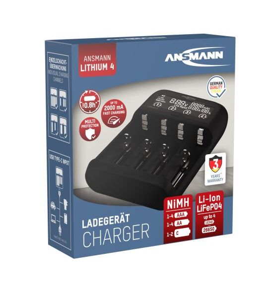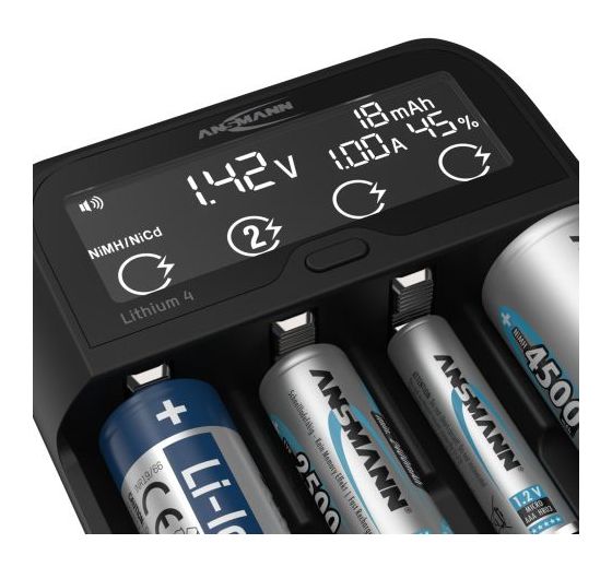 Speziell im Lithium-Segment werden eine Vielzahl von Akkugrößen angeboten. Mit dem Lithium 4 Ladegerät von ANSMANN entscheiden Sie sich für den universellen Allrounder mit bestem Preis-Leistungsverhältnis. Sie können bis zu 4 Li-Ion oder Lithium-Eisenphosphat (LiFePO4) Akkus der Baugrößen 26650, 22650, 18650, 18500, 17670, 16340, 14500 uvm. oder 1-4 NiMH Micro AAA, Mignon AA oder 1-2 Baby C Akkus unabhängig voneinander laden. Das Gerät erkennt eingelegte NiMH und Li-Ion Akkus vollkommen automatisch, lediglich bei der Ladung von LiFePO4 Akkus müssen Sie nach dem Einlegen die Zellchemie manuell einstellen, bevor der automatische Ladevorgang startet.