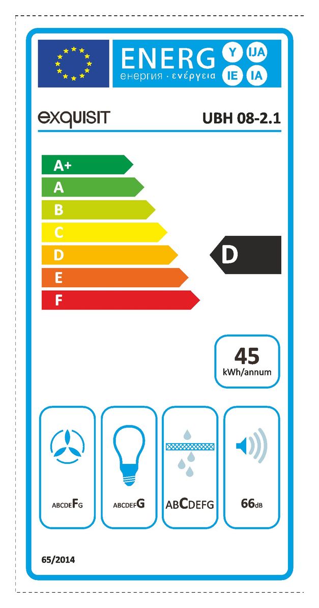 Exquisit UBH 08-2. Maximale Absaugleistung: 136 m³/h, Absaugart: Geleitet, Fluiddynamische Effizienzklasse: F. Typ: Wandmontiert, Produktfarbe: Edelstahl, Steuerung: Tasten. Fettfiltertyp: Karbon, Anzahl Filter: 1 Stück(e). Lampenleistung: 28 W, Anzahl an Lampen: 1 Glühbirne(n), Leuchtmitteltyp: Halogen. Energieeffizienzklasse: D, Jährlicher Energieverbrauch: 45 kWh, Energieeffizienzskala: A+ bis F