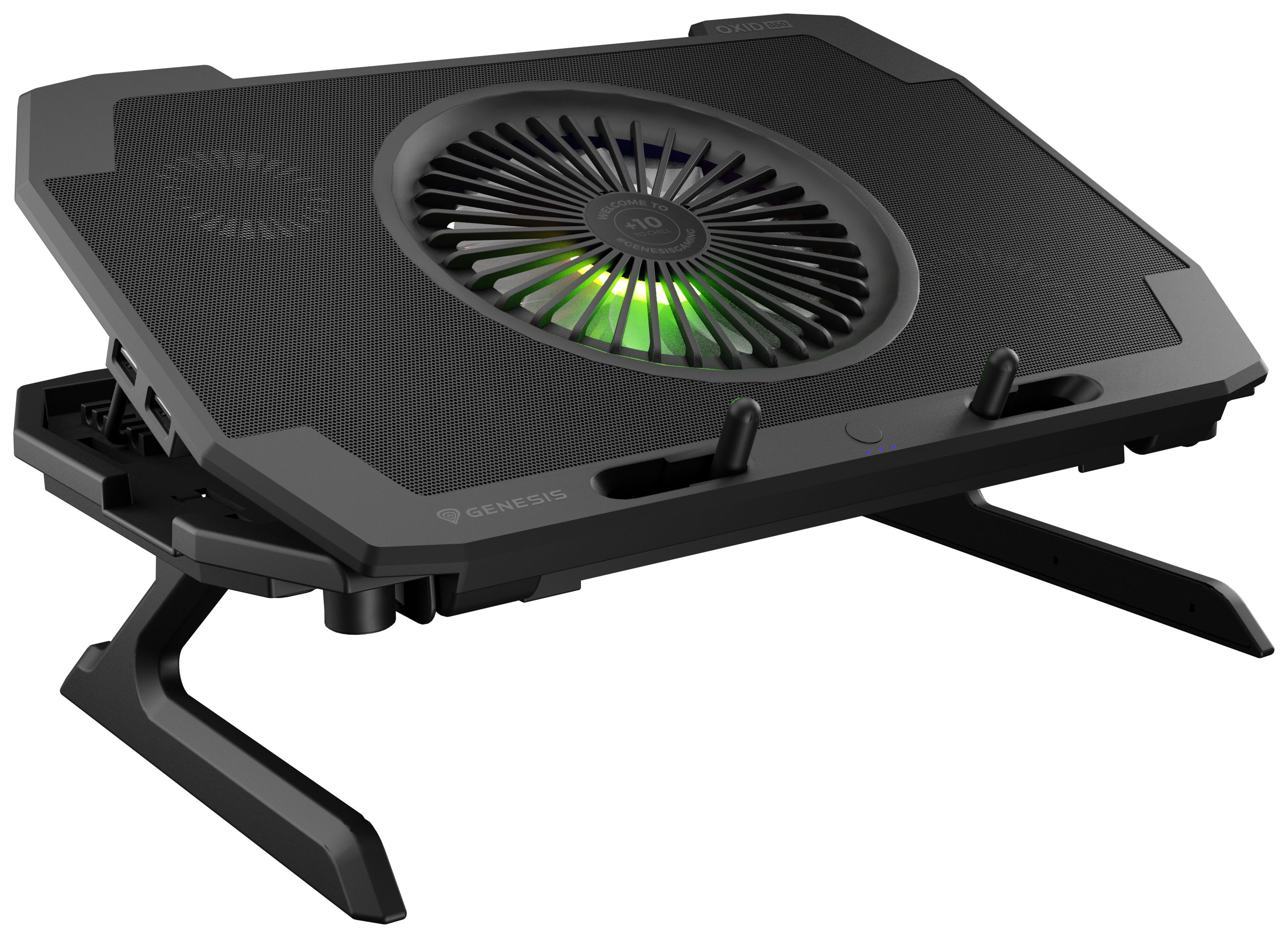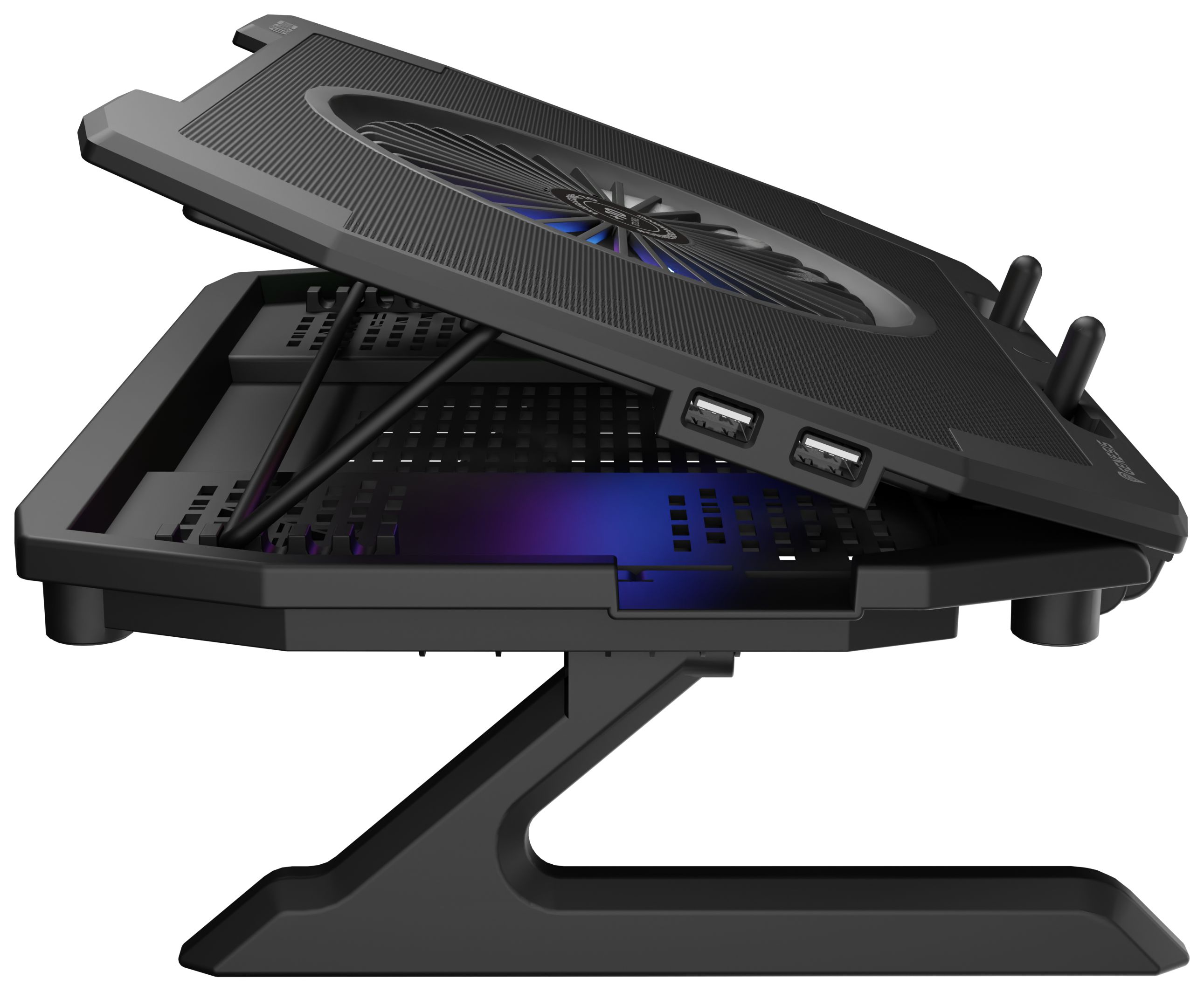 Oxid 850 ist ein Kühlständer für Laptops mit einer Diagonale von bis zu 17,3", der bei intensiven Gaming-Sessions die richtige Temperatur des Geräts aufrechterhält. Seine klappbaren Füße verbessern die Ergonomie beim Arbeiten und die spektakuläre RGB-Beleuchtung des Hauptlüfters ist die perfekte Ergänzung für jeden Gaming-Raum.
