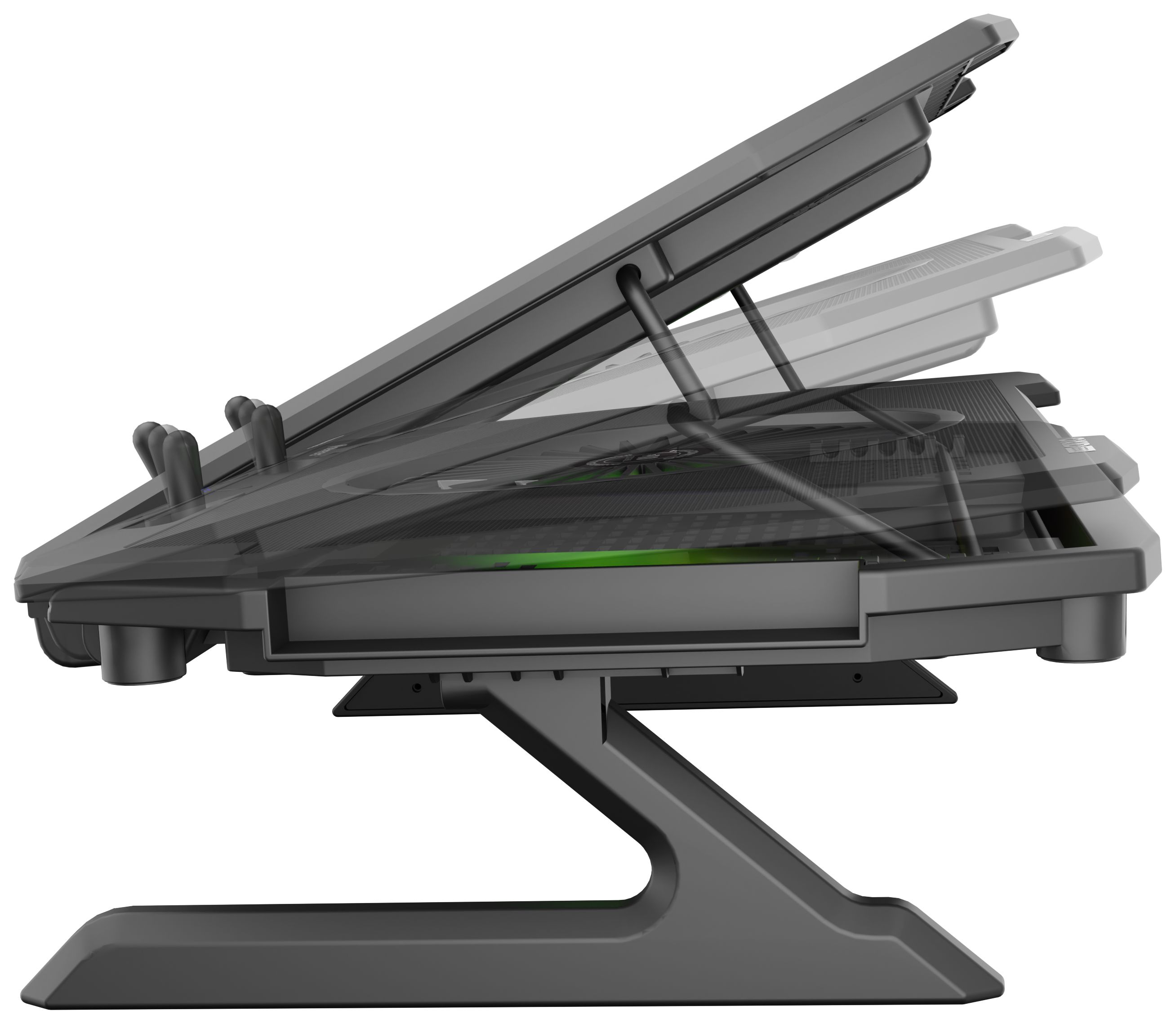 Der Ständer ist mit einem effizienten und sicheren Kühlsystem ausgestattet, das auf vier kleinen Lüftern basiert, die die Wärme unter dem Laptop abführen, und einem Hauptlüfter, der kalte Luft in den Laptop leitet. Die richtige Positionierung der Lüfter sorgt für eine äußerst effektive Kühlung, und die dreistufige Geschwindigkeitsregelung ihrer Rotation senkt die Temperatur des Laptops selbst bei den härtesten Kämpfen effektiv.