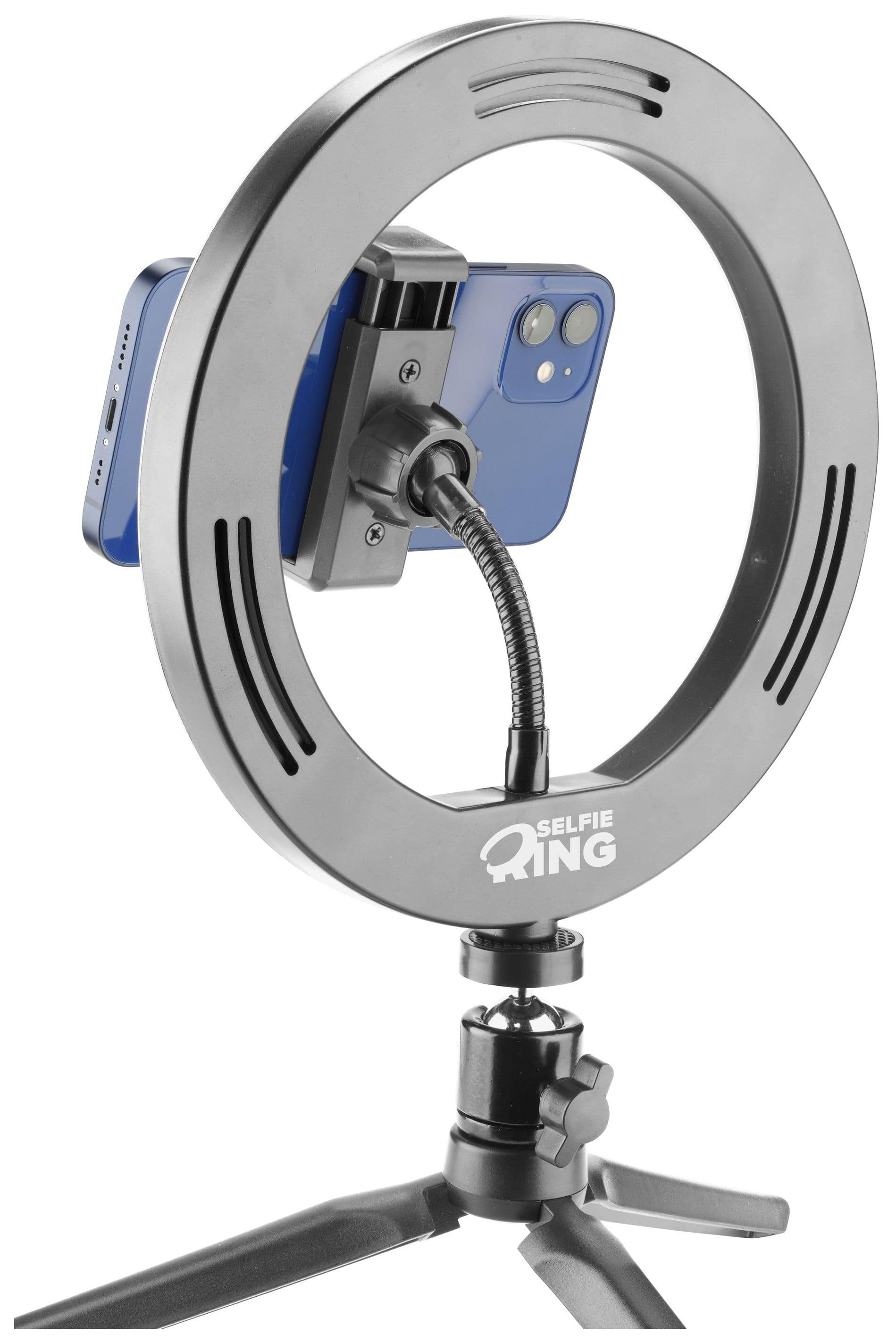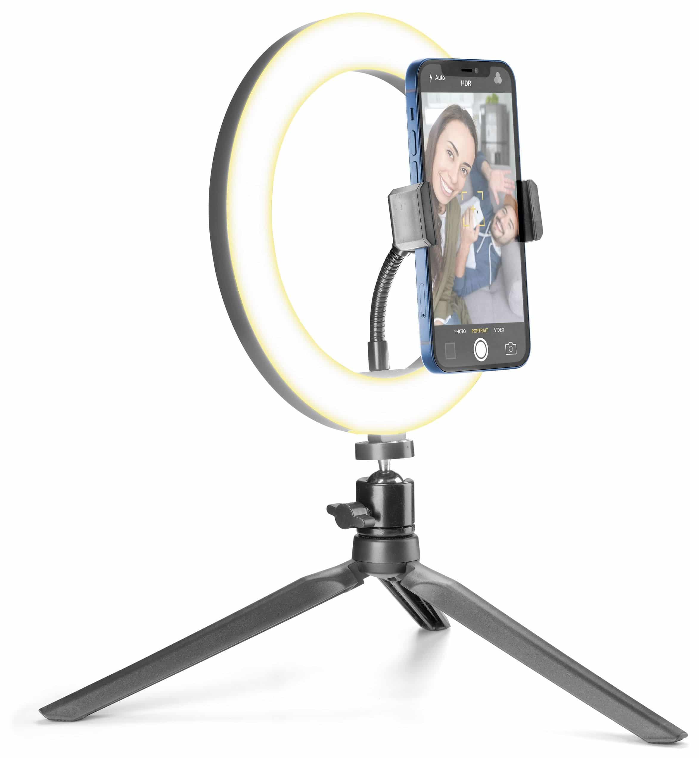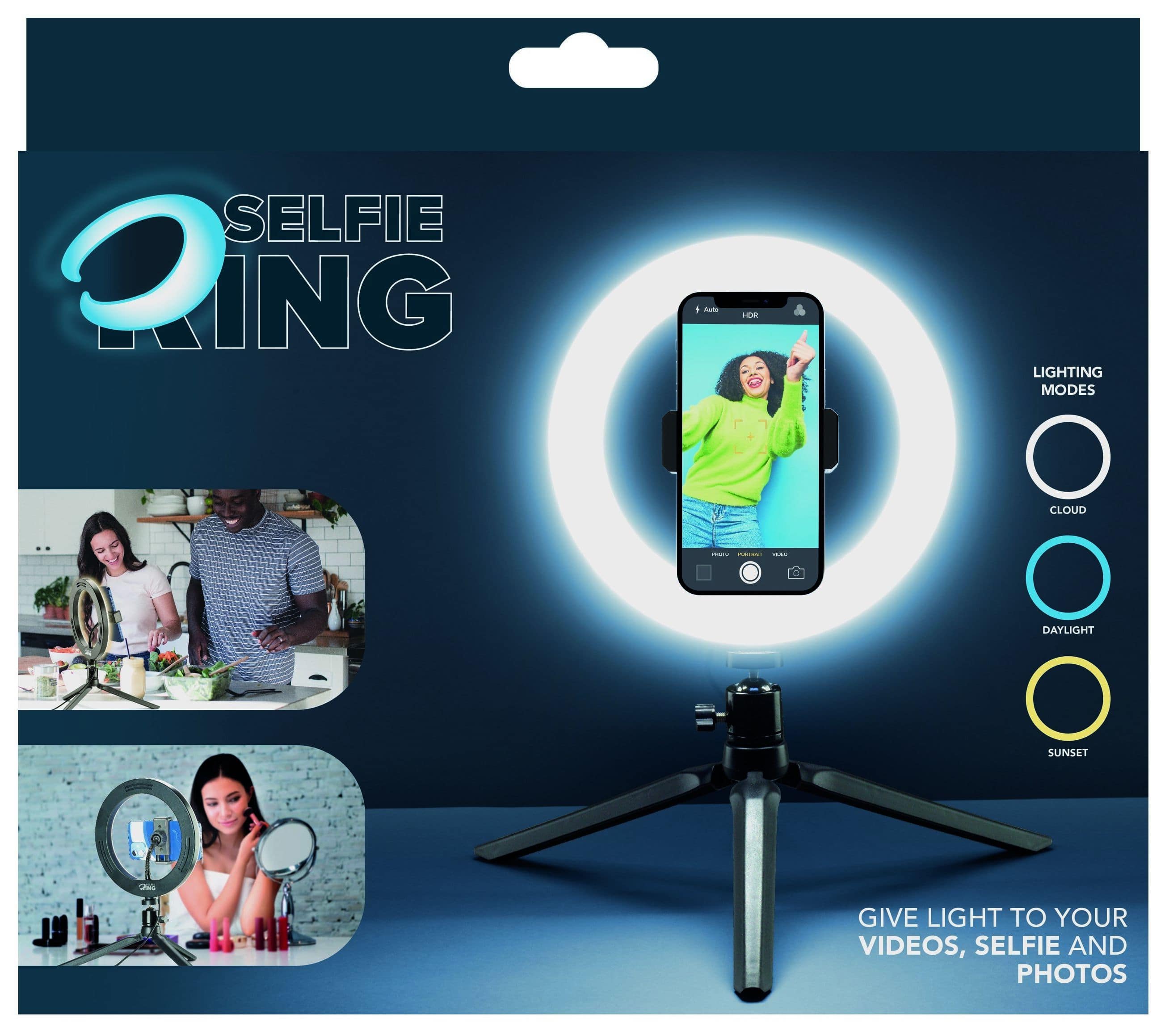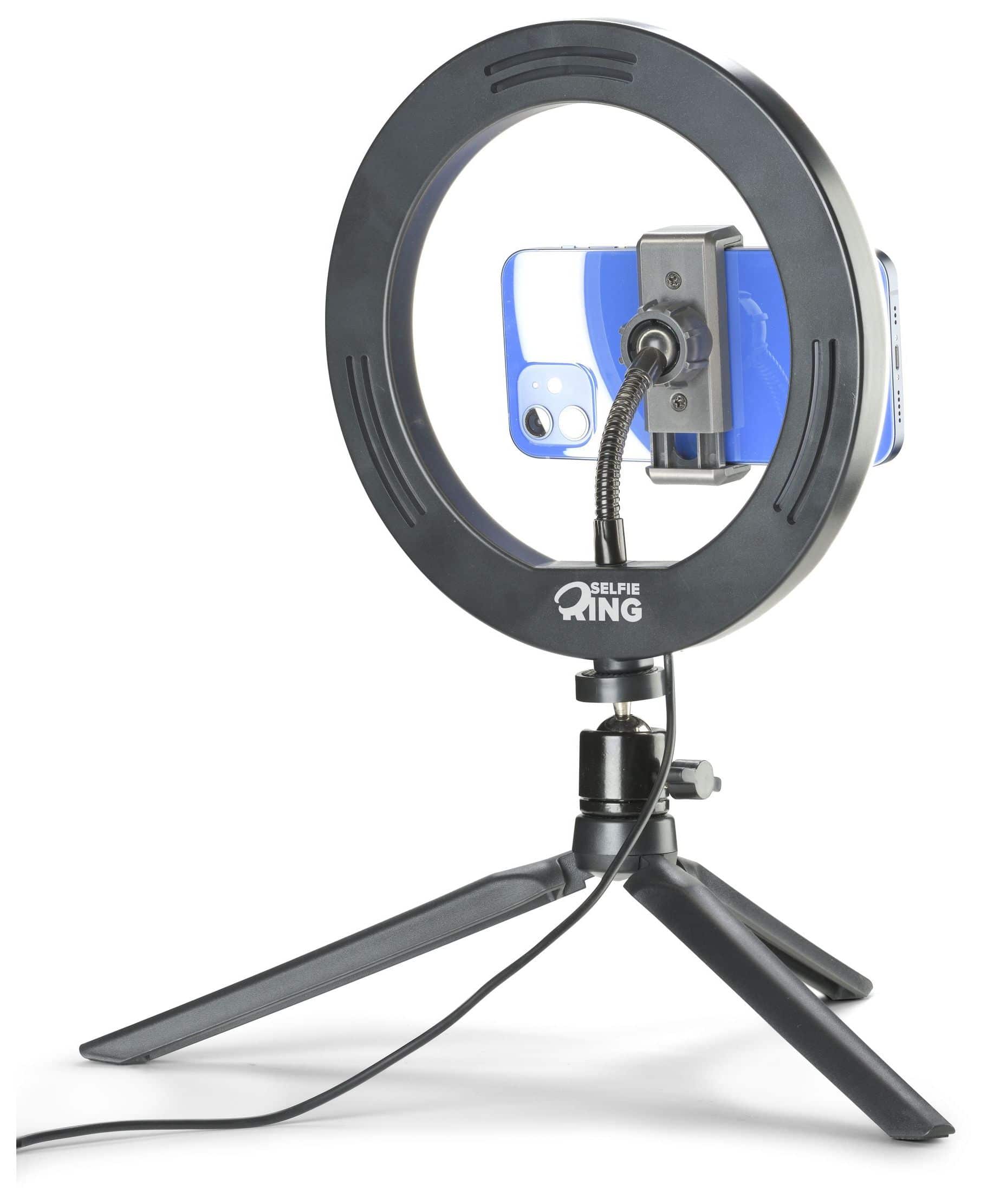 Für Videoaufnahmen und Selfies gibt es SELFIE RING, das Smartphone-Stativ mit Leuchtring, das jeden Ort in ein Filmset verwandelt! Der LED-Ring verfügt über drei Beleuchtungsmodi, die per Fernbedienung aktiviert werden können, und das Stativ ist für professionelle Aufnahmen einstellbar und drehbar.