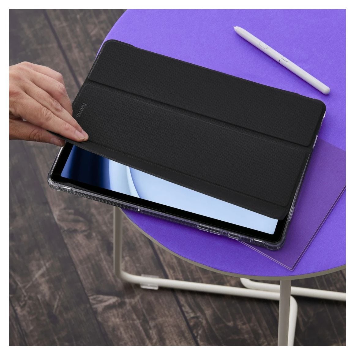 Stabiler Stand für das Tablet: einfach das Front-Cover am Tablet-Case umklappen, das Tablet aufstellen und bequem zum Arbeiten nutzen – in zwei Stufen für den perfekten Blickwinkel