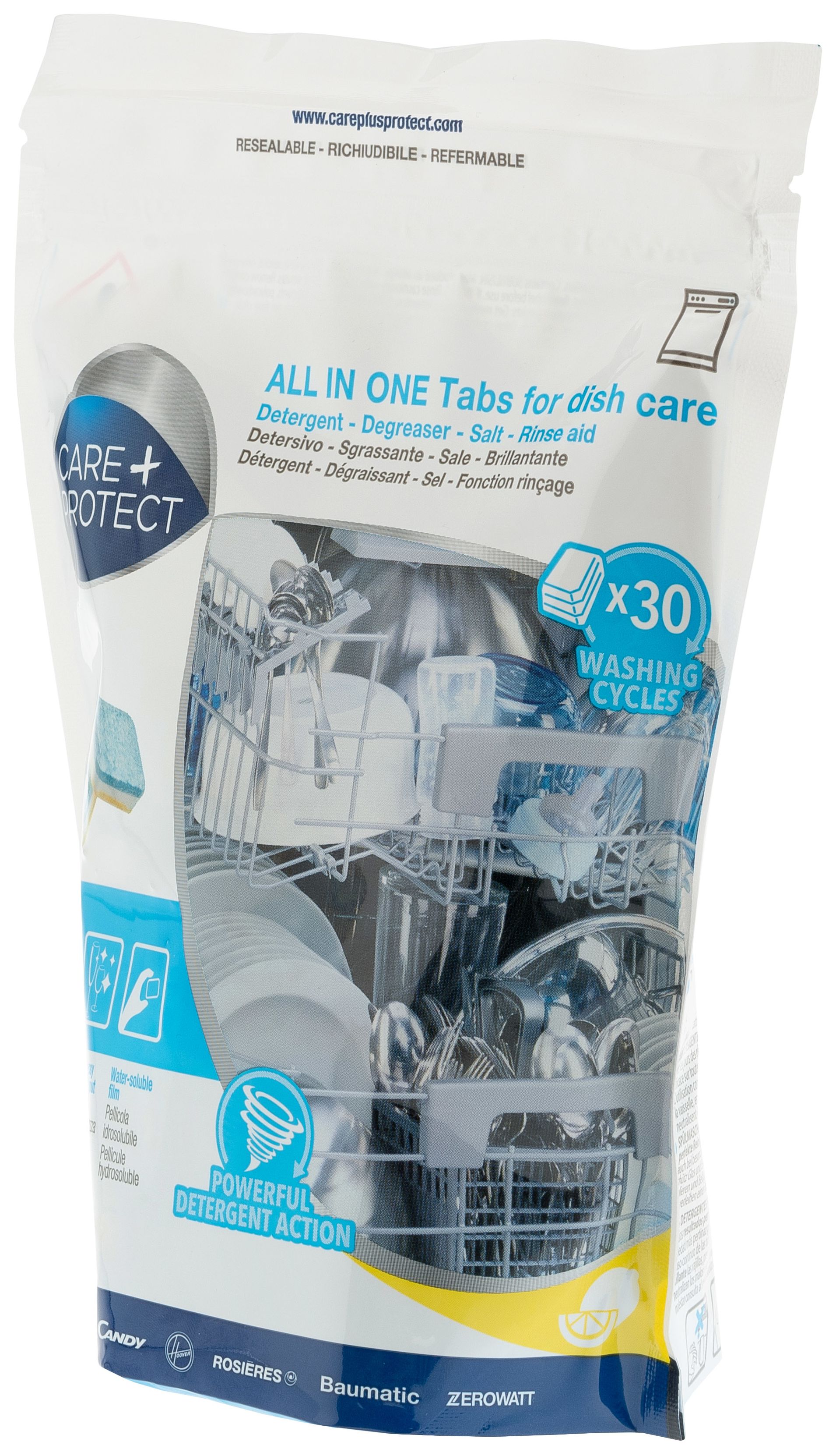 Care + Protect LDT2030. Produkttyp: Geschirrspülmittel + Klarspüler + Salz, Produktform: Tablet, Substanz: Tablet (substance). Gewicht: 540 g, Verpackungsbreite: 85 mm, Verpackungstiefe: 155 mm. Menge pro Packung: 30 Stück(e), Verpackungsart: Polybag