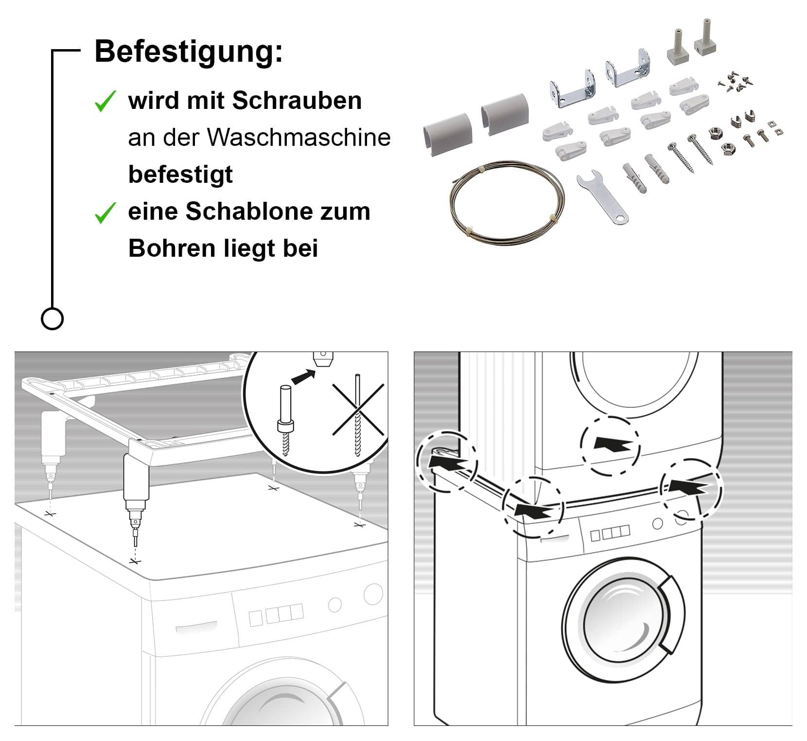 Einfach zu montieren, Gerät passt super in die Halterung und wackelt nicht. Schleudern ebenfalls für die obenstehende Maschine kein Problem. Sieht sauber aus.
