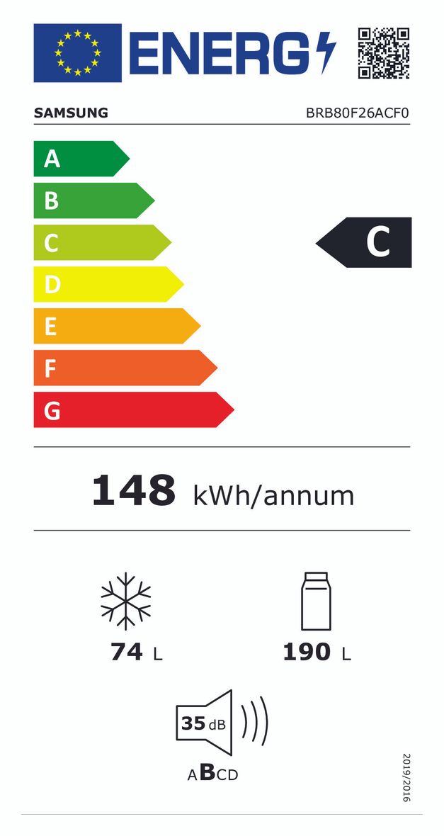 Samsung BRB80F26ACF0 190 l / 74 l 193,8 cm Einbau Kühl-/Gefrierkombination 185 kWh NoFrost für 910,00 Euro