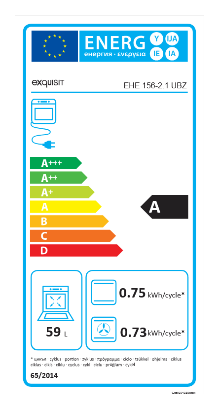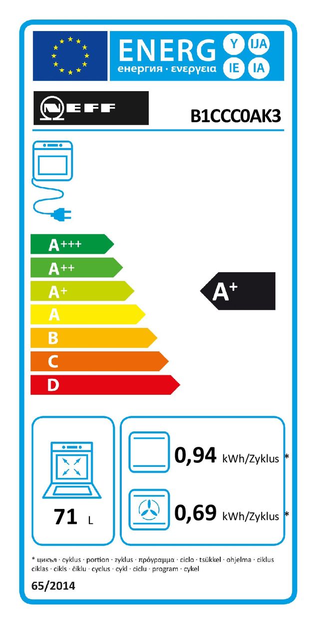 Die Energieeffizienzklassen von Backofen-Sets umfassen insgesamt 7 Stufen, die von A+++ (effizienteste Energieklasse, grün) bis D (ineffizienteste Energieklasse, rot) reichen. Die Energieeffizienzklasse berechnet sich aus dem Stromverbrauch und der Größe des Garraums (Volumen in Liter). Um jedoch die anfallenden Stromkosten der einzelnen Geräte direkt miteinander zu vergleichen, empfiehlt es sich, den tatsächlichen Stromverbrauch pro Nutzung miteinzubeziehen, der auf dem EU-Label getrennt für Ober-/Unter-Hitze und Umluftfunktion angegeben ist.