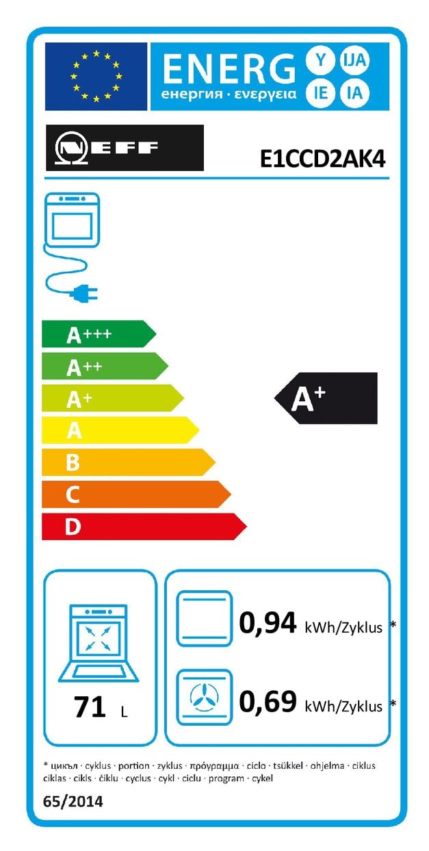 Die Energieeffizienzklassen von Backofen-Sets umfassen insgesamt 7 Stufen, die von A+++ (effizienteste Energieklasse, grün) bis D (ineffizienteste Energieklasse, rot) reichen. Die Energieeffizienzklasse berechnet sich aus dem Stromverbrauch und der Größe des Garraums (Volumen in Liter). Um jedoch die anfallenden Stromkosten der einzelnen Geräte direkt miteinander zu vergleichen, empfiehlt es sich, den tatsächlichen Stromverbrauch pro Nutzung miteinzubeziehen, der auf dem EU-Label getrennt für Ober-/Unter-Hitze und Umluftfunktion angegeben ist.
